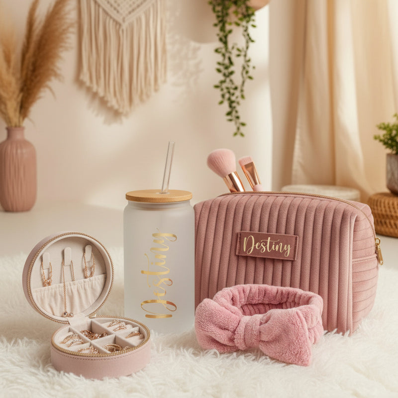 Shop personalized gifts for your bridesmaid proposals, girls trips, spa day, birthday celebration and more. We can add logos, text, symbols, your design etc. Personalized robes, slippers, totes, cosmetic bags, tumblers, glasscans, trucker hats and more.