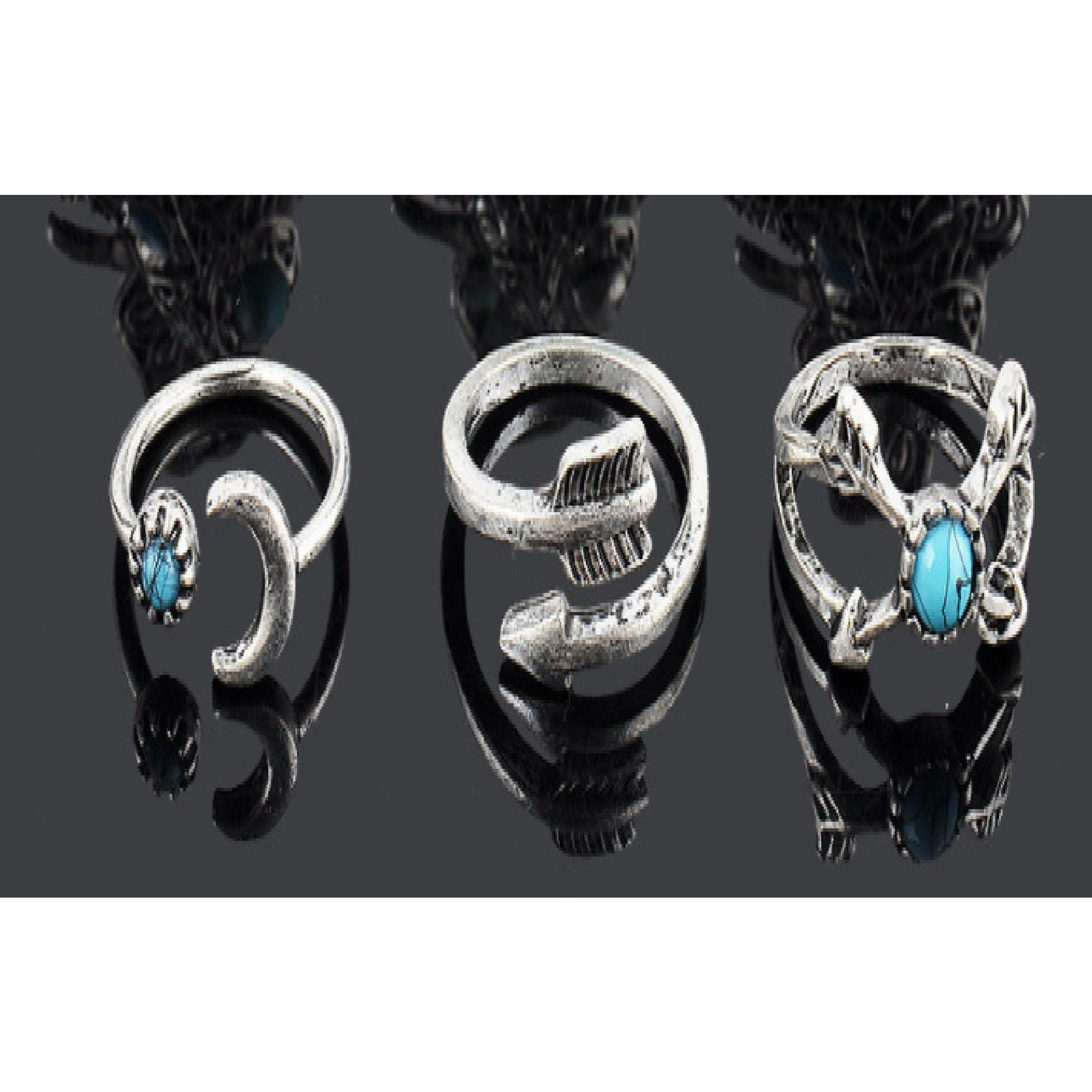 Stylish Vintage Boho Ring Set, Arrow Style, 6 Pieces, Turquoise w Antique Silver Designs