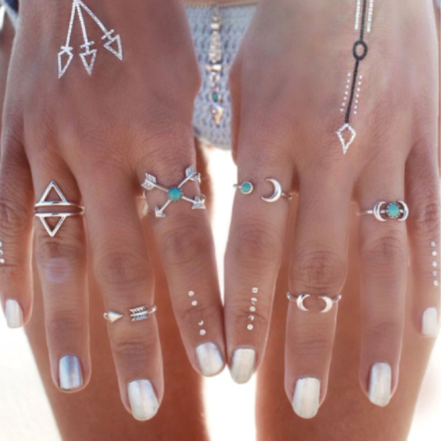 The Stylish Vintage Boho Ring Set is great for any boho fashion lover. This set is very symbolic as there is a ring with two arrows meaning life and movement and there are two rings with crescent moons meaning empowerment and change. It is a great pair to any outfit, especially because the rings are silver plated. It will also add a hint of color to your complete outfit as it does have turquoise in the gems.
