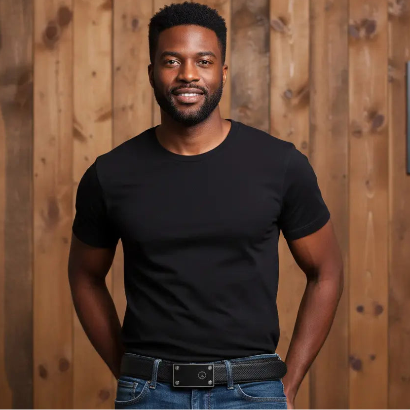 • Well-crafted Mens automatic genuine leather belt with a stylish buckle featuring a PEACE SYMBOL. Belt strap is 1.4” wide.  Buckle is roughly 1.6” wide by 2.7” long