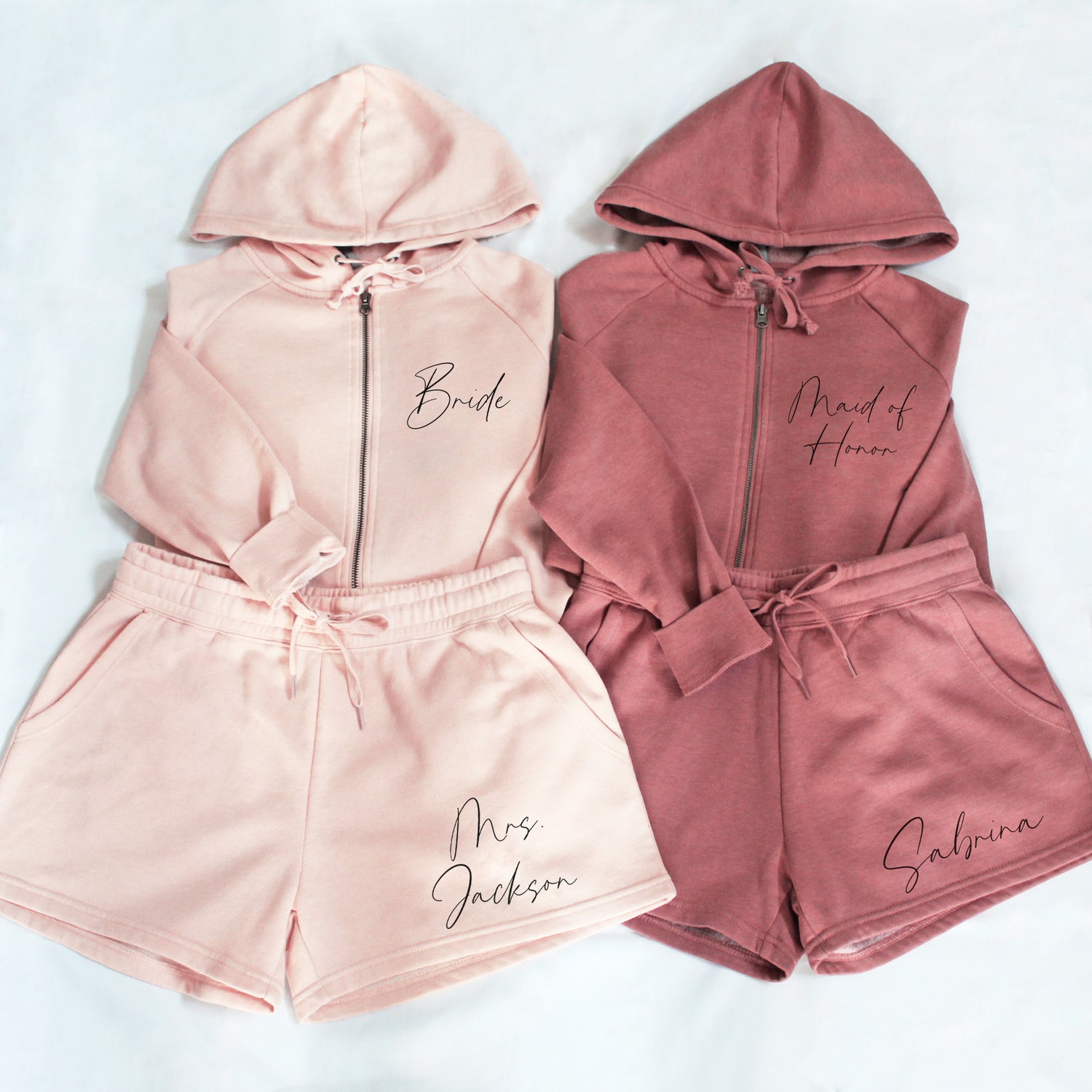 Oh so cute and comfortable Bride Lounge Sets for the entire Bridal Party or Bachelorette Party. Perfect as Bride PJs, or to wear while getting ready for the big day. This custom sweatsuit comes with a full zipped hoodie paired with either matching shorts or joggers. These bridesmaid lounge sets are also great for girl's trips. Needing different size tops and bottoms for your set? We've got you covered! For these custom lounge sets, you can choose a same size top and bottom or get the perfect fit by mixing your sizes to fit your shape and style. These make great Bridesmaid Gifts and are perfect for photo opps. Use as a Bridesmaid pajama set, casual loungewear to wear during the day at various activities and more. Sets are available from sizes XS-2XL. Our custom Bride pajamas can be personalized with name and title for that unique touch.