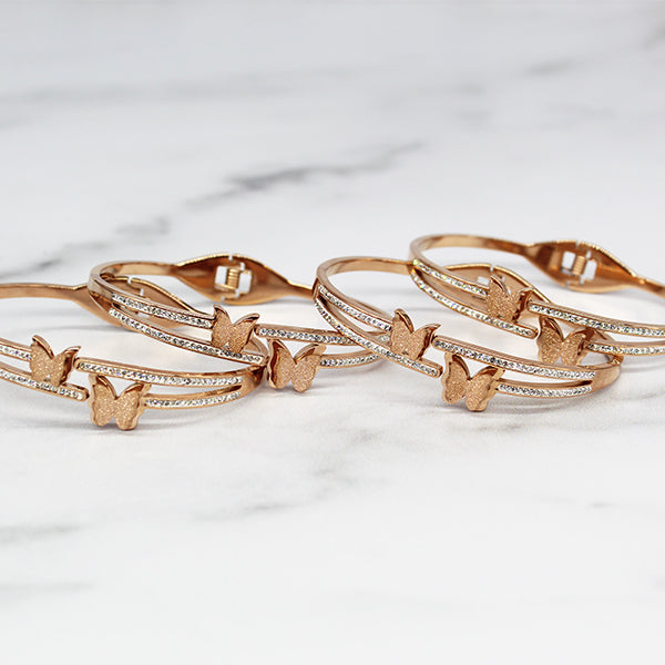 - This stunning bracelet is crafted from Titanium Steel and finished with gold plating. It features two frosted butterflies, symbolizing beauty and undying love, surrounded by cubic zirconia embellishments