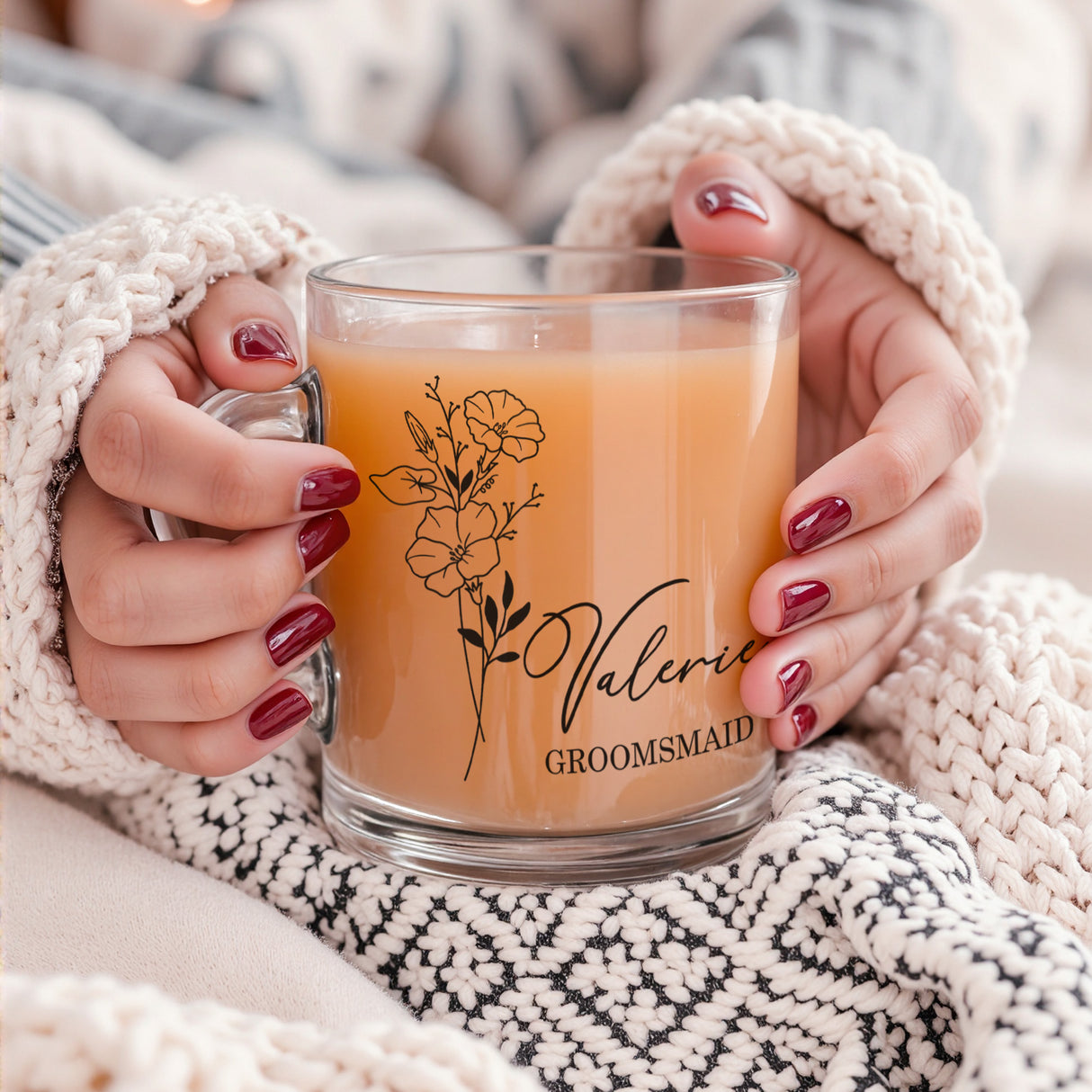 This Personalized Bridesmaid Birth Flower Glass Mug is the perfect custom bridesmaid gift. Choose between a clear or frosted glass design featuring a personalized birth flower and custom name. Ideal for bridal party gifts, bridesmaid thank you gifts, and bridal shower gifts.