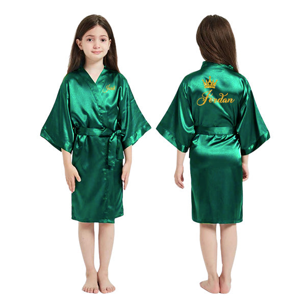 Choose from girls white robe, black robe, rose gold robe, tiffany blue robe and rose pink robe in child sizes 3T/4T, 6/7, 8/10 and 12/14. All our BluChi girls bathrobes come with inside tie strings for a secure close, sash with loops and made with a blend of polyester and spandex for a silky, smooth fit.