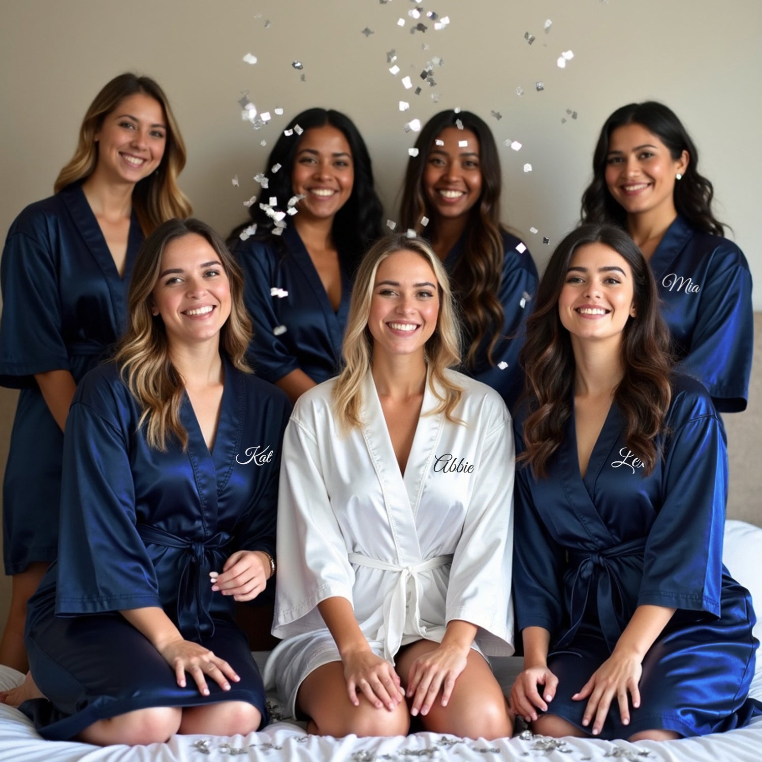 Elegant bridesmaid robe set of 7. Our BluChi robes can be personalized in the front and back to give you a custom look. Robes are perfect for getting ready for wedding, bachelorette parties, birthday parties, spa parties, girls trip and more. Robes are available in 26 colors including White, Turquoise Blue, Navy Blue, Ocean Blue, Mint Blue, Black, Burgundy/Wine, Champagne Gold, Rose Pink, Rose Gold, Emerald Green, Dusty Blue, Royal Blue, Terracotta/Rust, Sage, Purple, Lilac, Red, Yellow Gold, Bright Pink, Mauve and more. Choose from Small/Medium (US size 4-8), L/XL (US size 9-14), XXL (US size 15-18), 3XL/4XL (US size 20-26), and 5XL/6XL (US size 28-38). Robes are also available for kids, from size 3T/4T to 12/14. In addition, we offer several fonts and text colors so our customers can create a customized look. All personalization are offered with super fast turnaround.