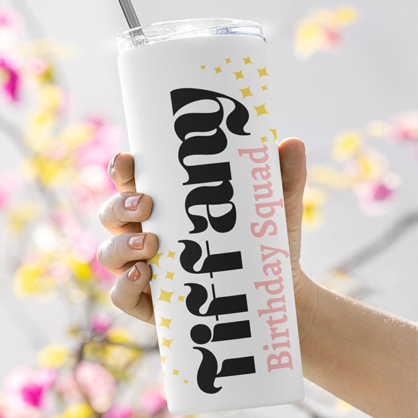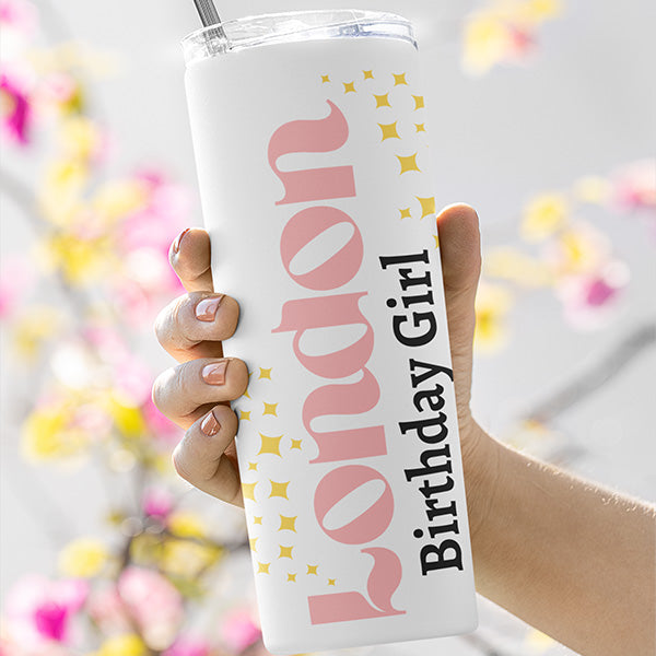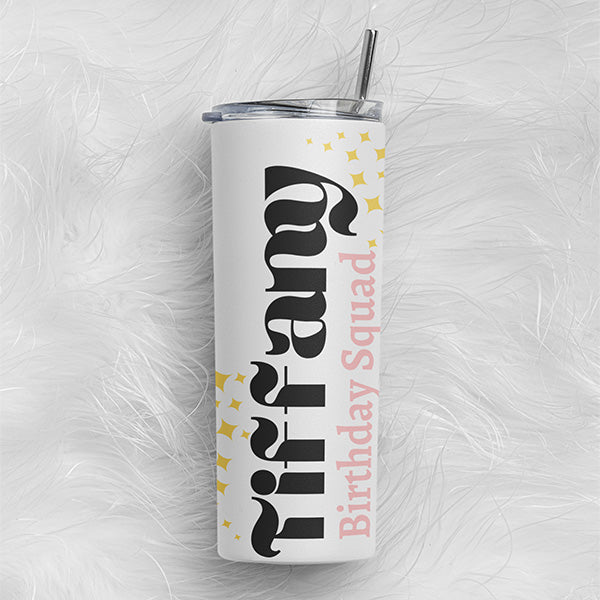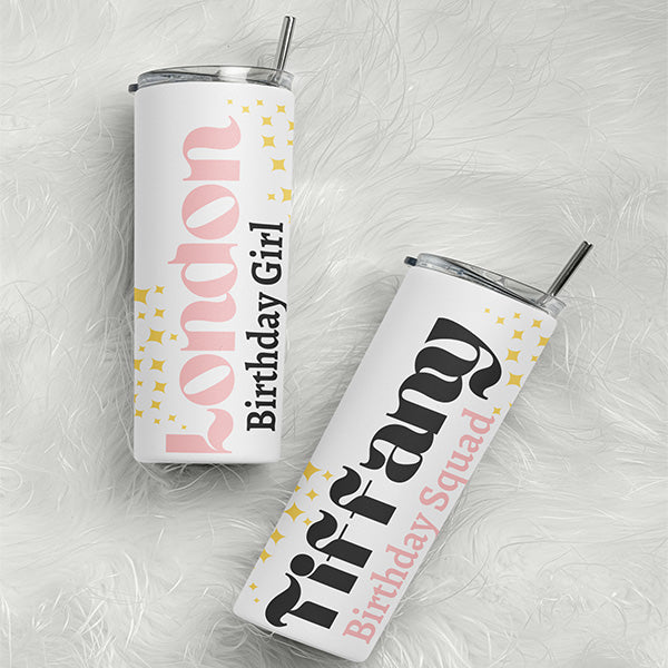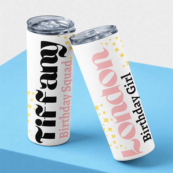Cute birthday tumblers for the birthday girl and birthday squad, designed with sparkles along the name and title.  Mix and match text colors to match your birthday theme color. Personalize with Name and Title in any color or colors you like. These 15 oz skinny tumblers ship quickly and will process in 1-2  business days. Skinny tumblers offer a great size, as they will fit in most cup holders, and are great when on the go. They work for both hot and cold drinks. You can send us a custom color, or choose from our standard colors. This set comes with a straw, rubber bottom and box. Items are BPA free and safe for use.