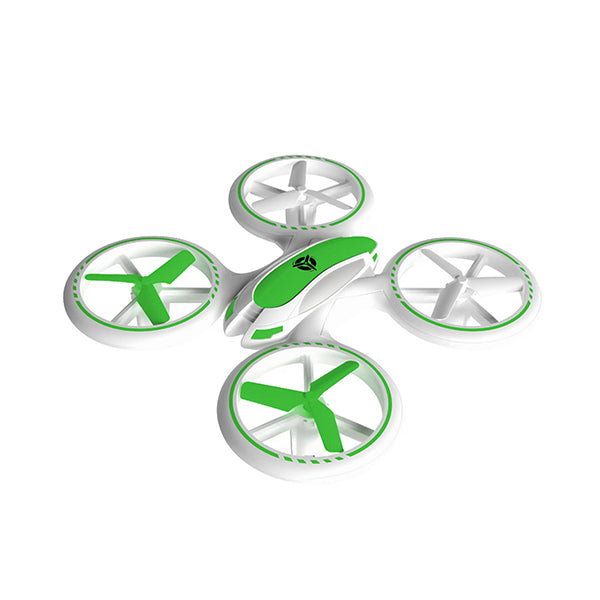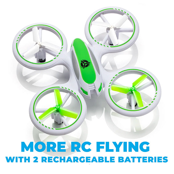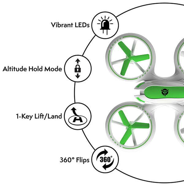 Features include: Bright LEDs on the drone that emit vibrant green and blue lights, making it easy to see even at night. It is also design to allow for longer flight times of up to 18 mins with two drone batteries. The drone spaceship flying features include altitude hold and it is able to fly in low and high speed. This kids and teen drone is also quite lightweight and portable measuring 5.5in by 5.5in.