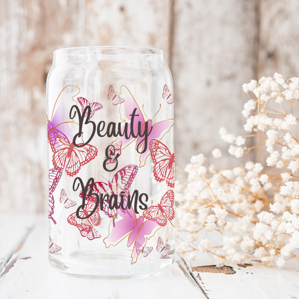 Beautiful hibiscus butterflies glass can for birthday parties, group events and more. These Libbey glass can are 16oz.