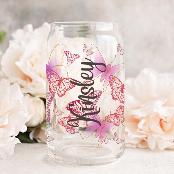 Our unique personalized tumbler glass can is designed with beautiful hibiscus butterflies and is such a cute gift for girls, preteens and birthday parties. Make every girl at the party or event feel special with their own personalized glass can. Personalize with name and pick from our 15 standard colors or send us your custom text color. Each glass is handmade and specially made to order for you. Our birthday glass cans are 16 oz (473 ml). Each glass can includes the bamboo lid (comes with silicone ring seal) and glass straw.  Makes a great gift for preteen girls, grand daughter, niece, daughter, birthday squad, birthday girl, or team. We recommend hand wash only.