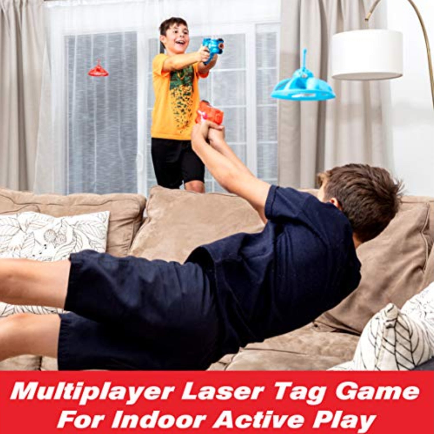 These laser tag games include 2 laser blasters with child-safe infrared sensors (less than 1mW output) and 2 rechargeable light up hovering target drones. Each blast comes with a target sensor built in so no vest is required. These toy guns feature 130-ft. range, life meter, sound FX, ammo reload buttons, LED lights, and vibration feedback; guns require (4) AAA batteries. Great for indoor or outdoor play. Recommended for ages 6 and up.