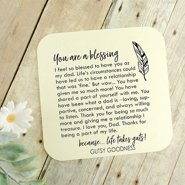 - The pendent has the encouraging words “Thank you for being the dad you didn’t have to be.”