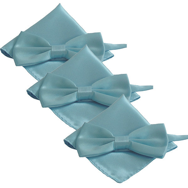 Mens Smooth Satin Feel Formal Pre-Tied Bow Tie and Pocket Square Sets - Baby Blue / 3 is backordered and will ship as soon as it is back in stock.