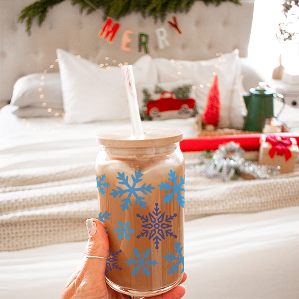 This 16 oz Blue Snowflakes Glass Cup is perfect for adding a festive touch to your drinks this holiday season.