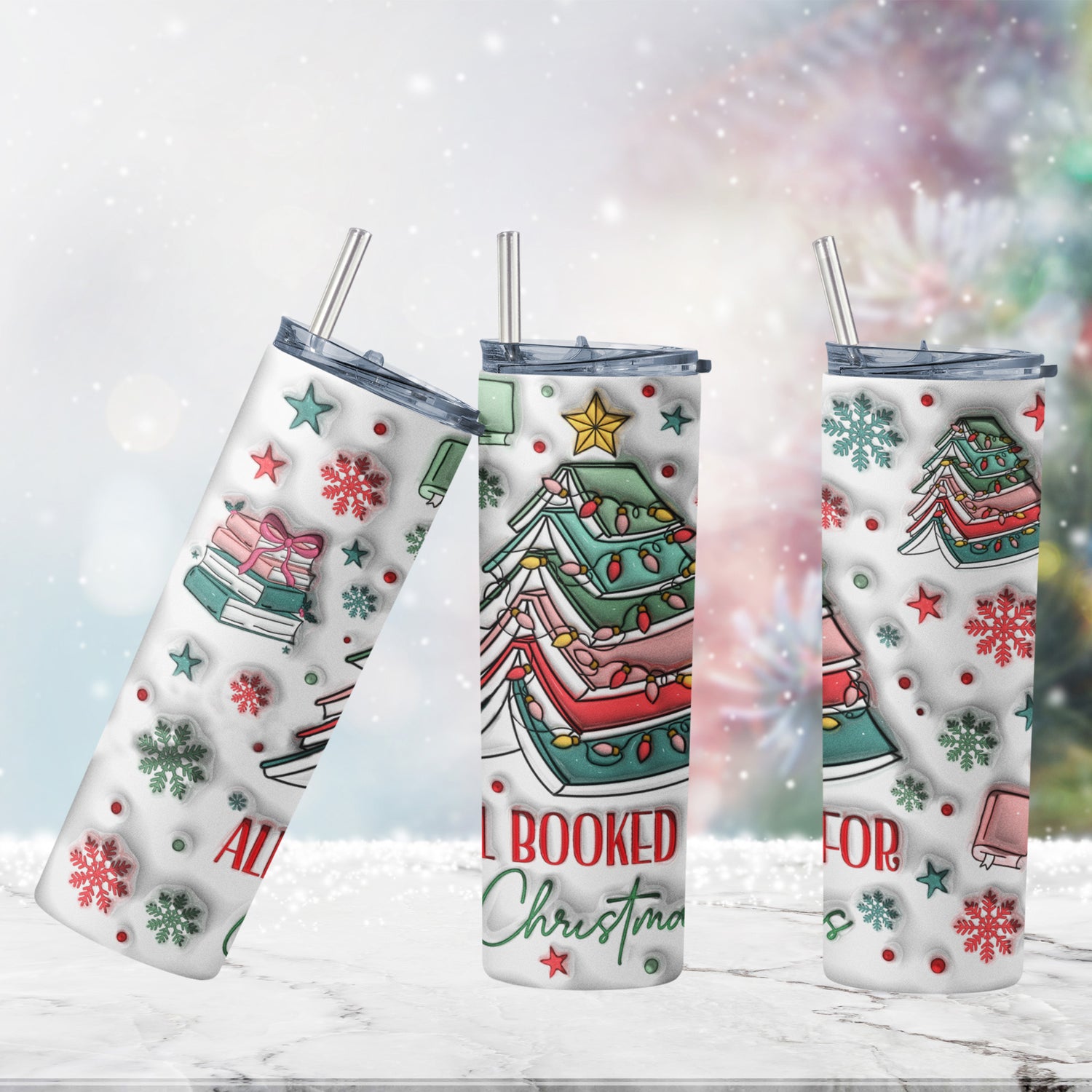 Cute 20oz All Booked For Christmas Tumbler with Inflated 3D Design for Book Lovers