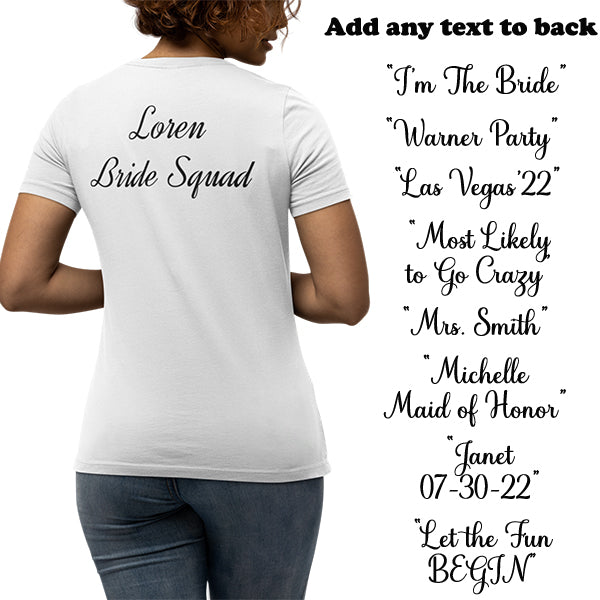 Custom Personalized Bachelorette Party T-Shirts for bride and bridesmaids. Available in all colors and styles, perfect for bachelorette parties, bridal showers, and wedding celebrations. Soft, comfortable, and made to order for a perfect fit. Ideal gift for the bride, bridesmaid gifts, and party matching shirts. Order your custom bachelorette tees today!