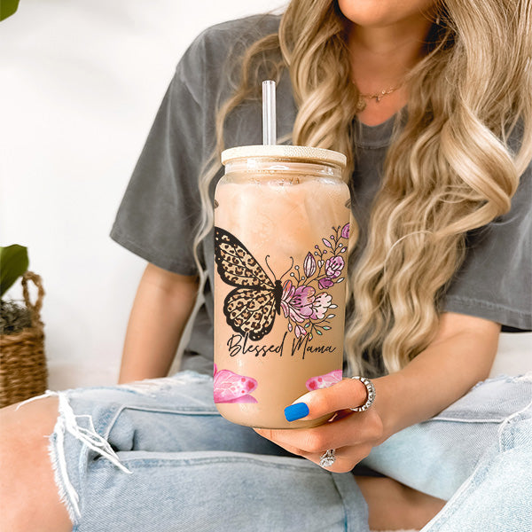 Floral and Butterfly Blessed Mama Frosted Iced Coffee Glass Tumbler