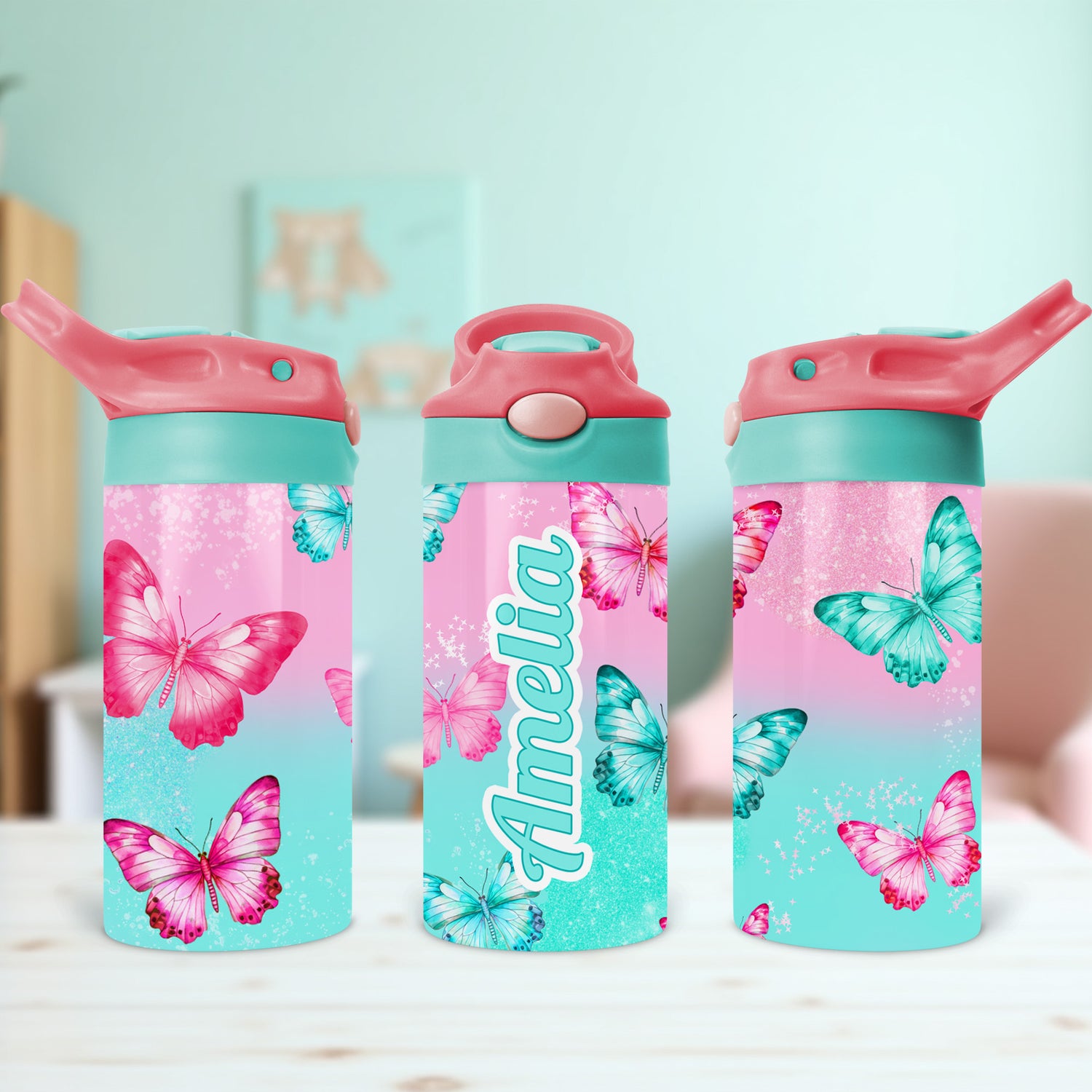 Butterfly Back to School Water Bottle with Name, Personalized Flip Lid Tumbler for Girls