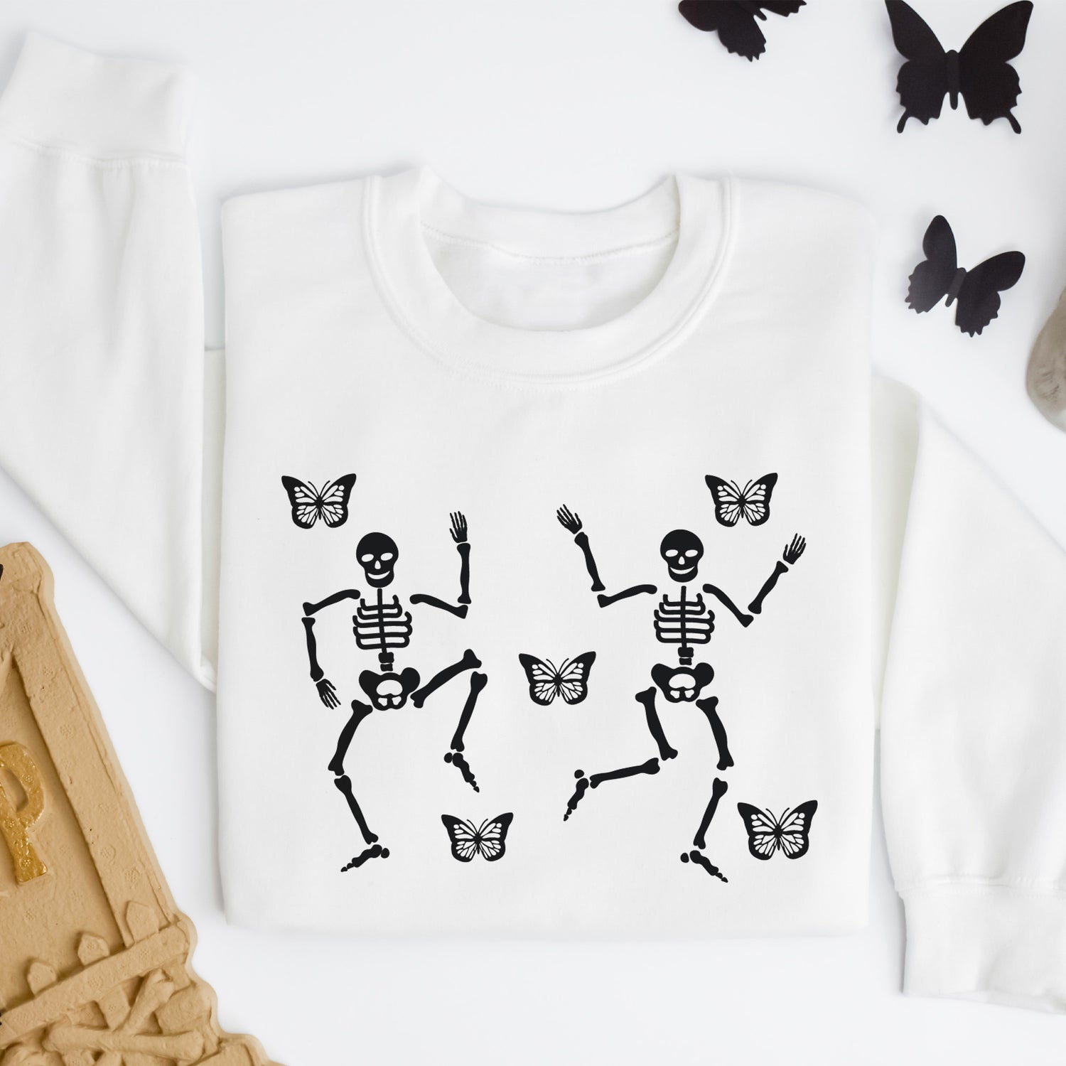 Dancing Skeletons with Butterflies Halloween Sweatshirts for Women - White / S is backordered and will ship as soon as it is back in stock.