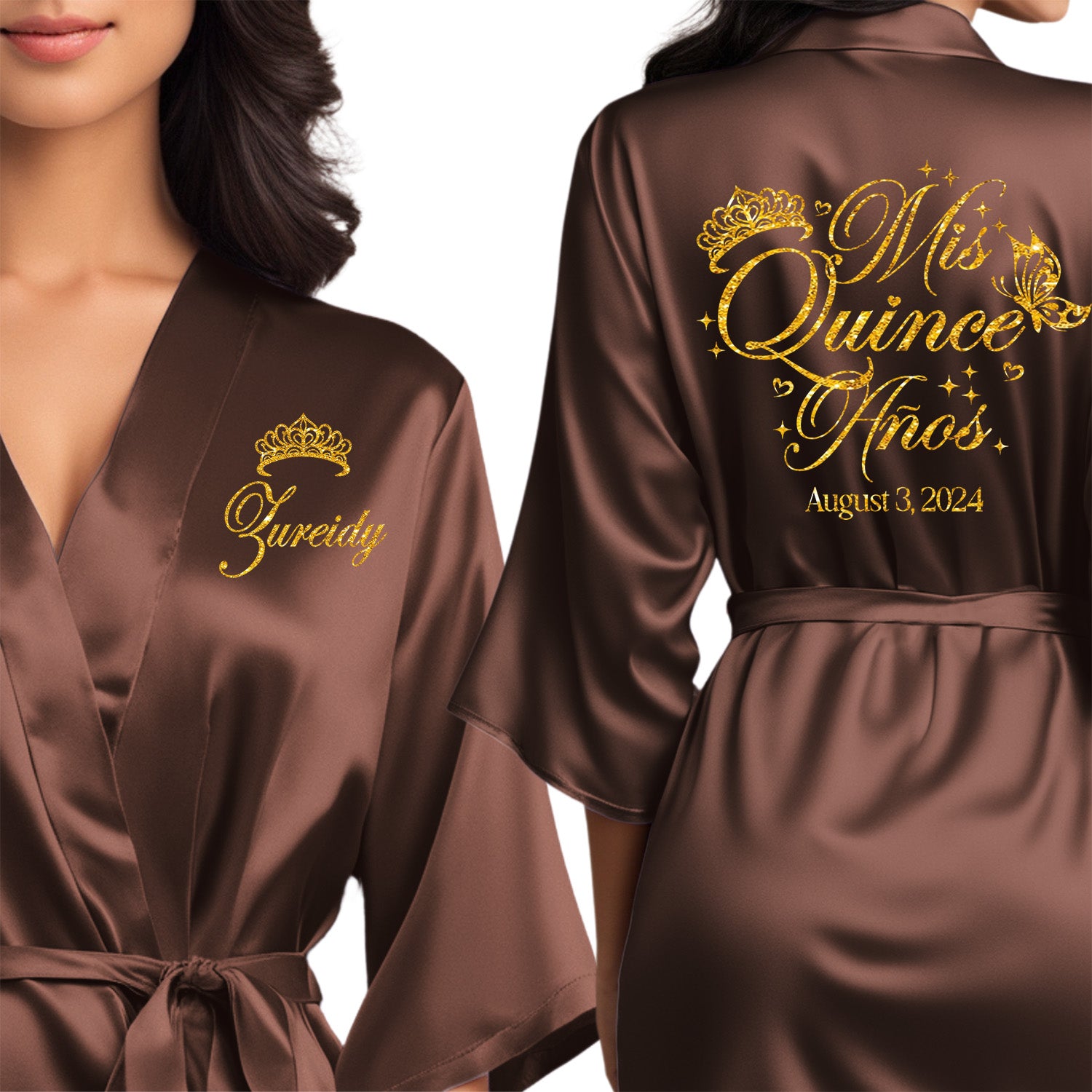 Personalized chocolate satin quinceanera robes. Beautiful getting ready mis quince anos robes with gold glitter. Cute robes for 15th birthday.