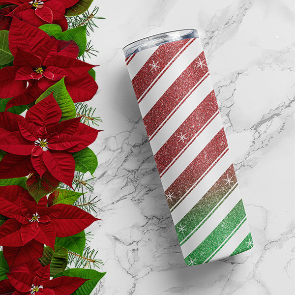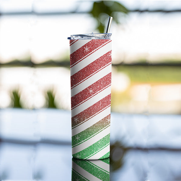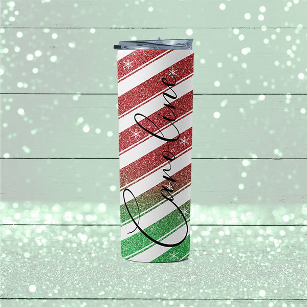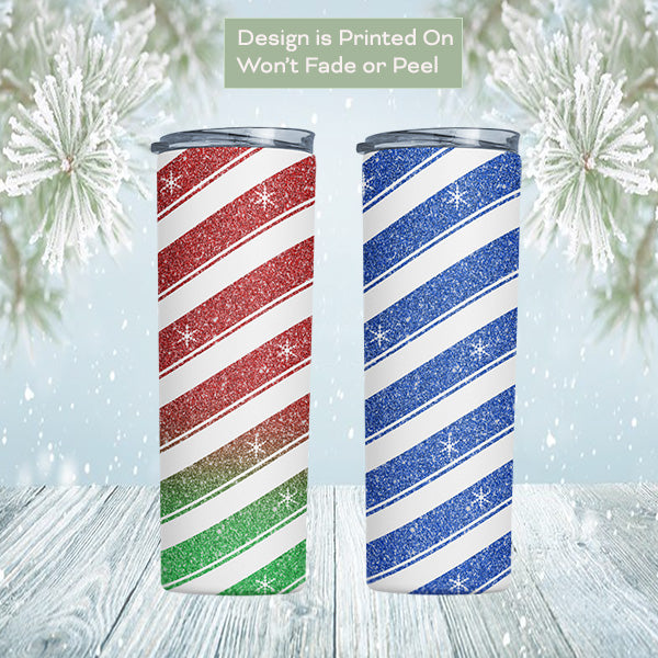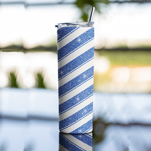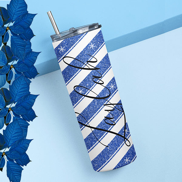 Skinny 20oz tumblers featuring snowflakes design for the Christmas Holiday season. These tumblers can be used during the entire winter season and makes a great gift for Christmas. These holiday tumblers can be personalized with name using our cursive or block font. Our tumblers are great for hot or cold liquids. The double insulated wall means your drinks are safe and will be kept cool or warm for hours. All tumblers are package in individual boxes and include straw and silicone rubber bottom. These are skinny 20oz tumblers so will fit easily in car cup holders and more.