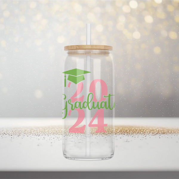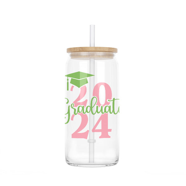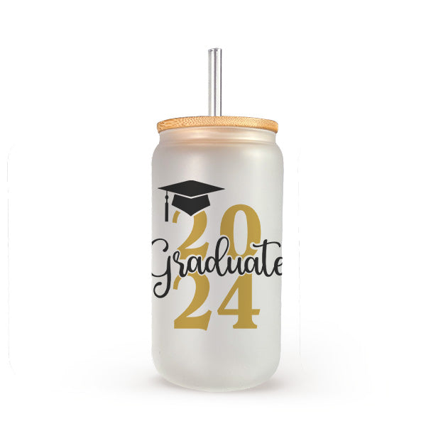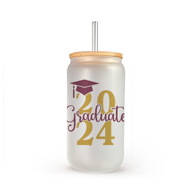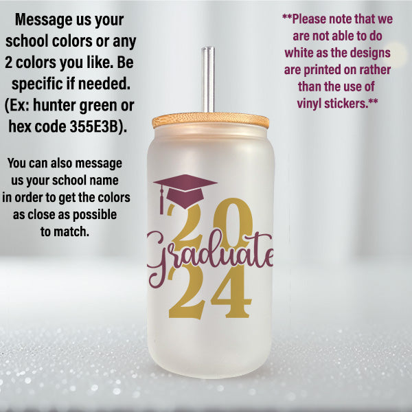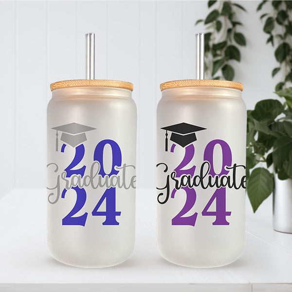 Personalize this graduation gift in your school colors. Celebrate a significant milestone with our 16oz Graduate 2024 Glass Can, the perfect tribute to hard work and dedication of the class of 2024. Available in both elegant frosted and classic clear styles, this custom grad gift is designed to honor the achievements of 2024 graduates, offering a daily reminder of their special year. Whether as a graduation gift for yourself or for the graduate in your life, this drinkware is a memorable keepsake for anyone stepping into a new chapter. Congrats to the class of 2024.