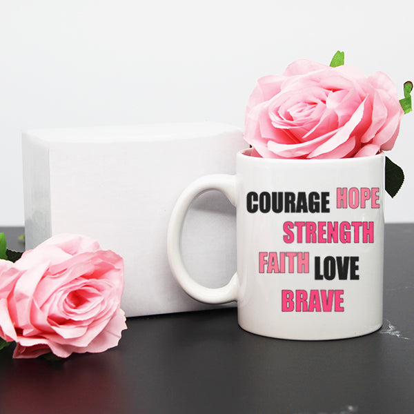 This Mug and also be personalized. Its a gift to show your support to the ones you love while they face one of the toughest challenges of their life. The words of encouragement, like Hope , Strength, faith, love and Brave are just some of the words. As a gift this Mug will being inspiration to help women with their fight against breast cancer.