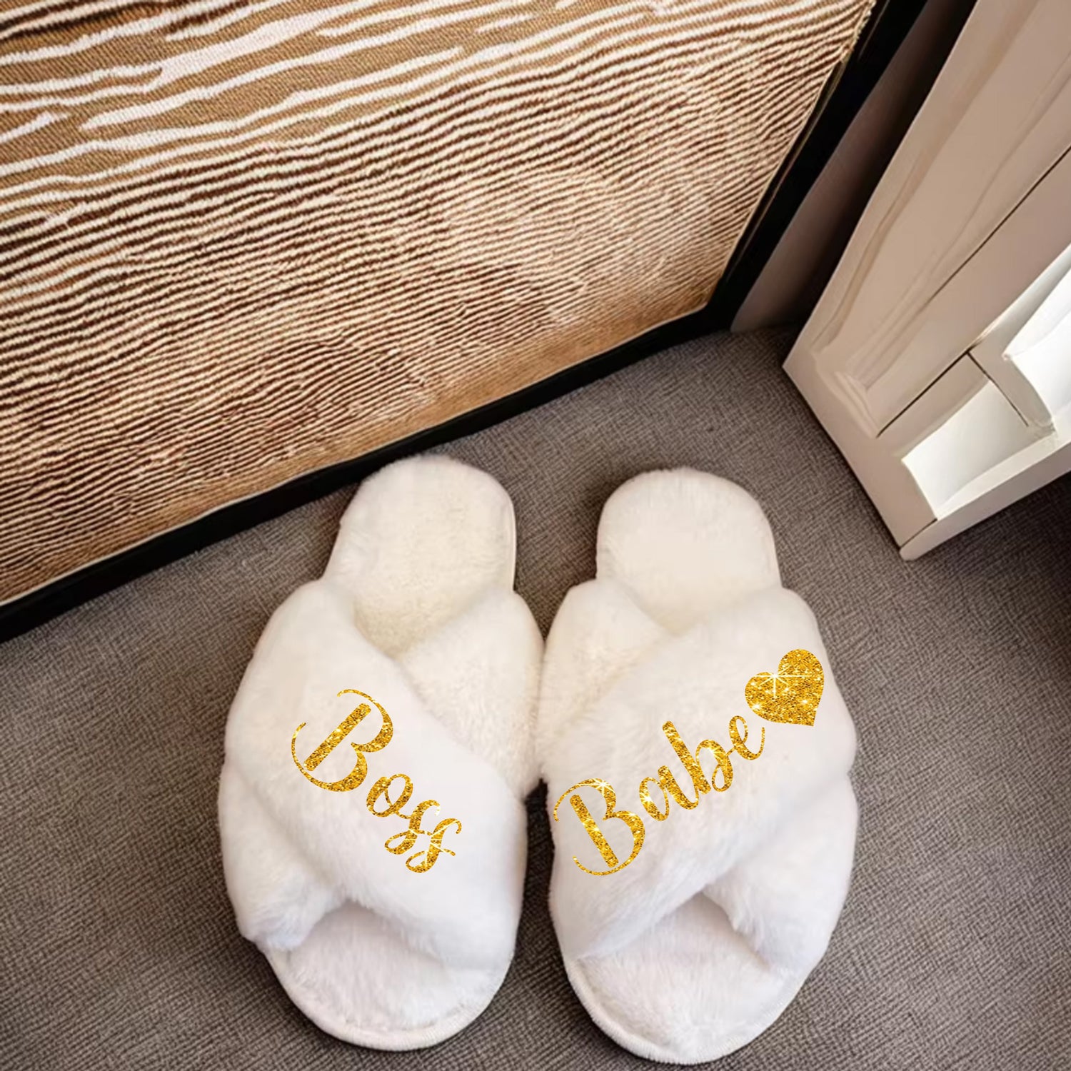 Women’s Fluffy Criss Cross Slippers with Glitter, Cozy Boss Babe House Slippers, Birthday Gift for Her