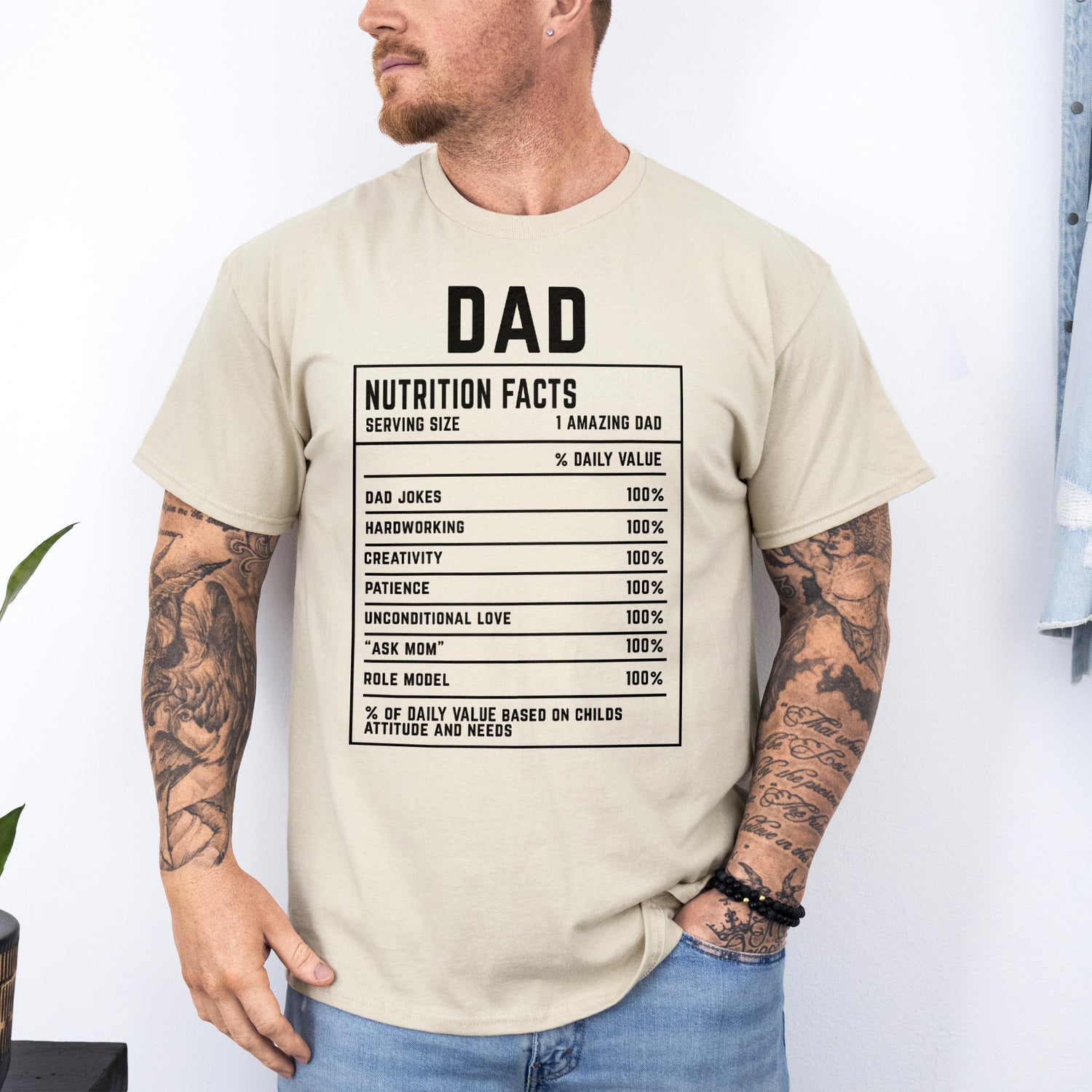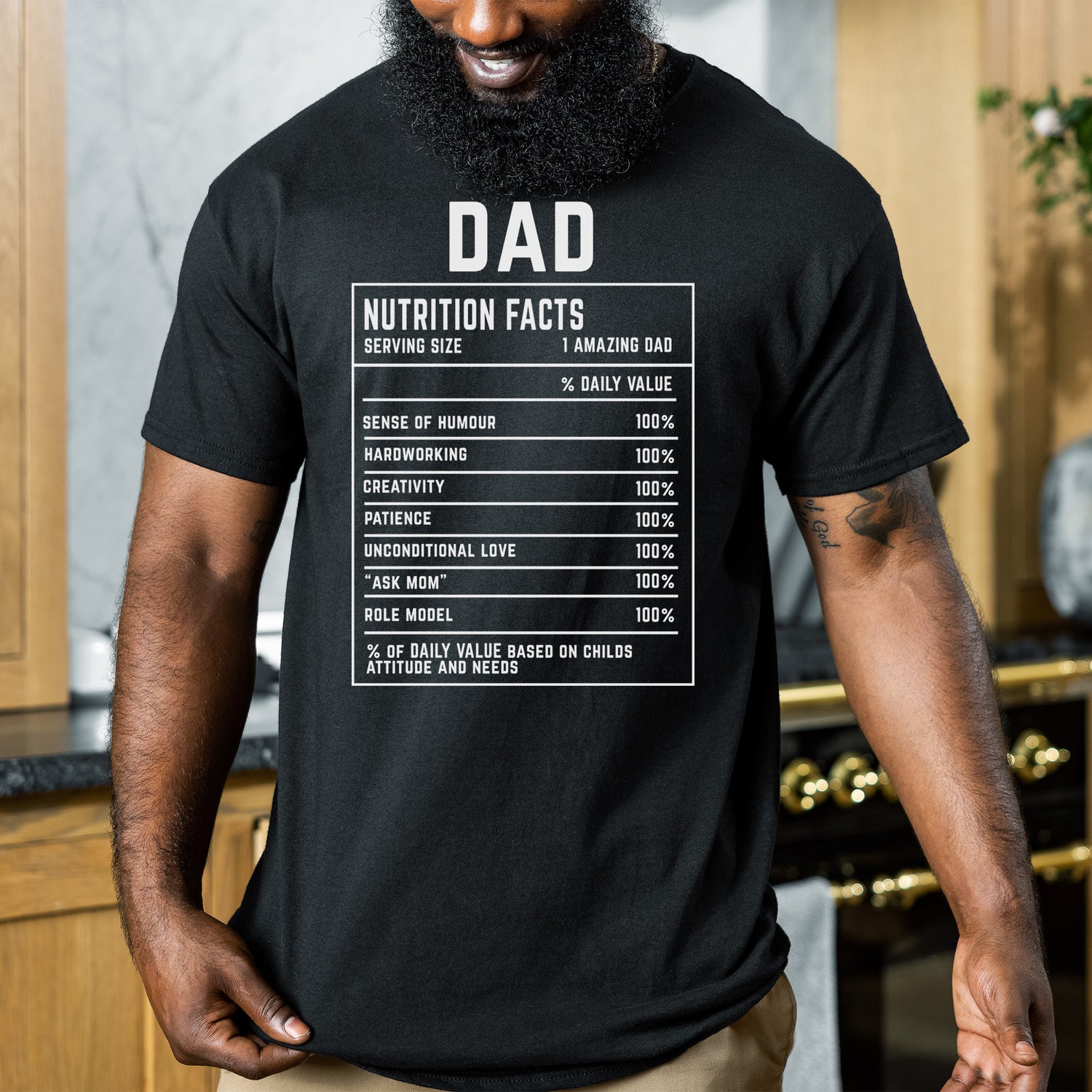 White custom Dad Nutrition Facts shirt featuring a funny joke graphic and personalized traits. Perfect for Fathers Day gifts.