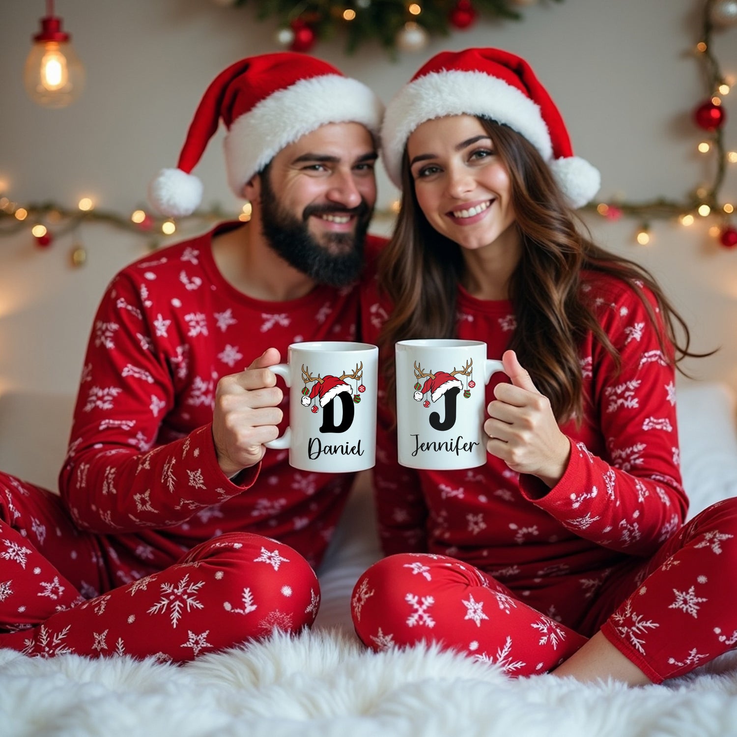 Fun Personalized Matching Christmas Mugs with Cute Reindeer Initial