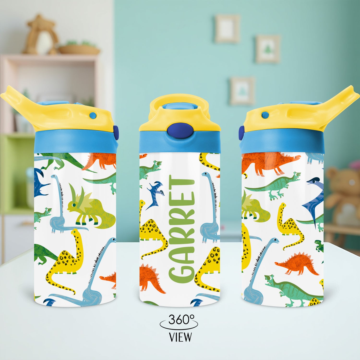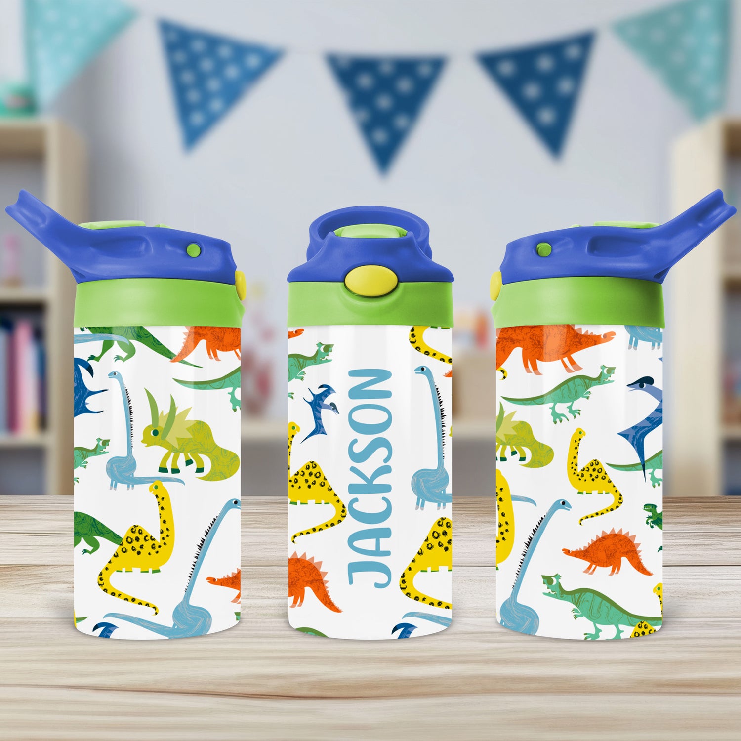 Dinosaur Water Bottle for Kids or Toddlers, Custom Flip Top Cup with Name for Boys
