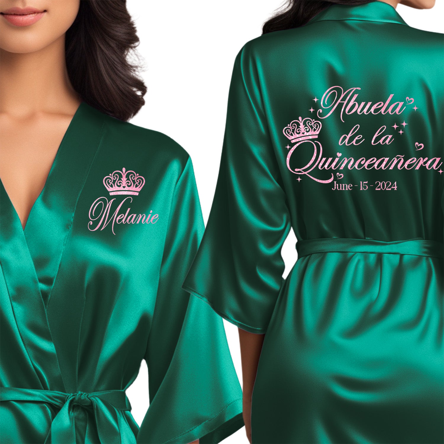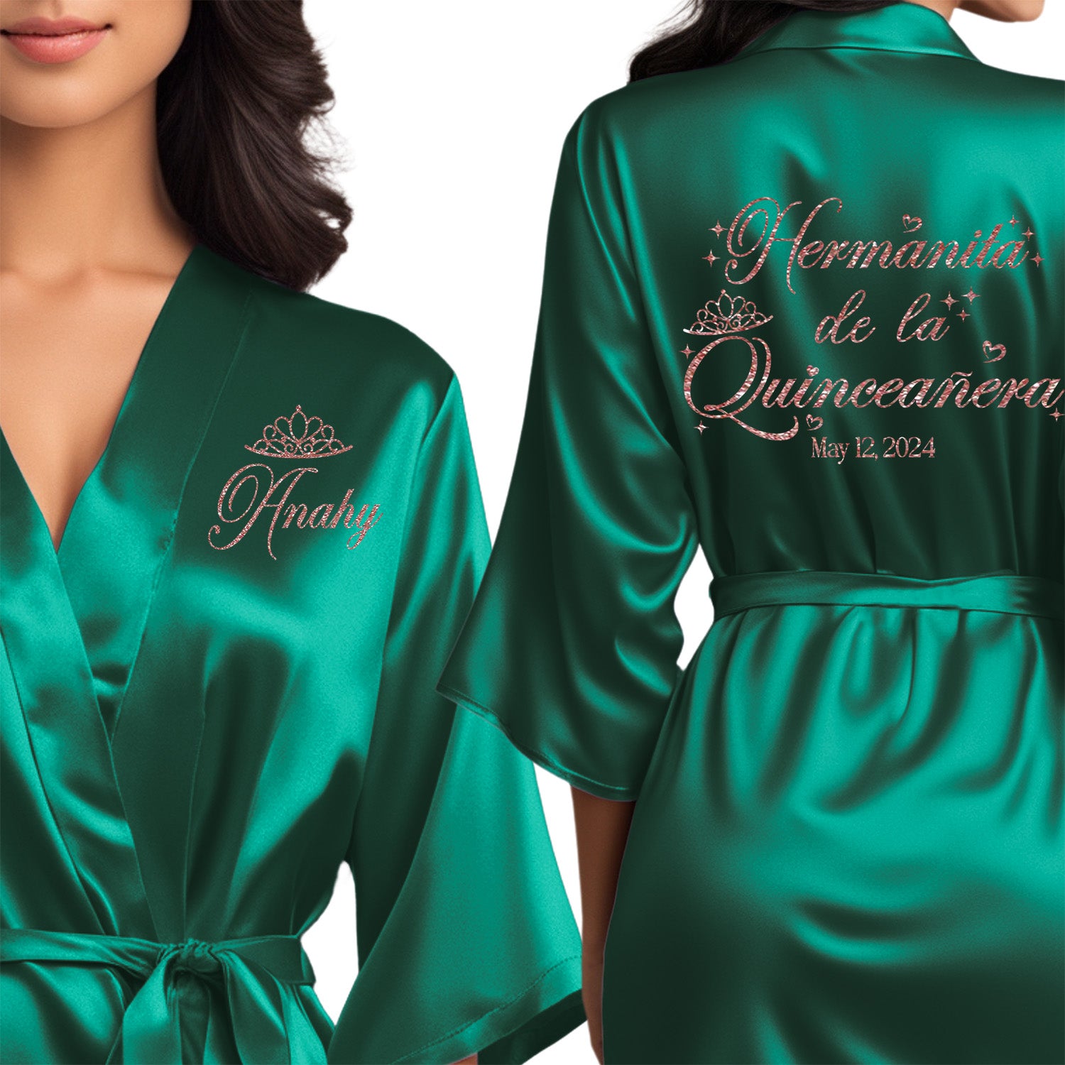 Step into your Quinceañera celebration in style with our Personalized Satin Quinceañera Robe. Crafted for your special day, this personalized Quinceañera robe exudes luxury and elegance. Ideal for getting ready moments and capturing unforgettable photos, it features beautiful glitter and regular text color options to match your Quinceañera party. Perfect for your Quince birthday, our personalized robe is a symbol of sophistication and grace as you embark on this milestone journey. Make your Mis Quince celebration truly memorable with our personalized robe for every member of the party. chose from Mis Quince Anos, Mama de la Quinceañera, Abuela de la Quinceañera, Tia de la Quinceañera, Hermana de la Quinceañera, Quinceañera Squad, Damas de la Quinceañera and more.