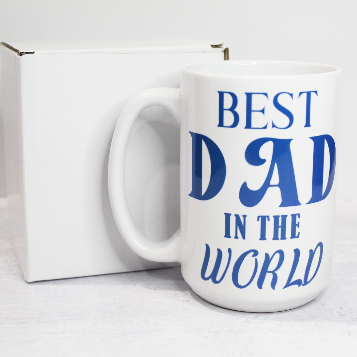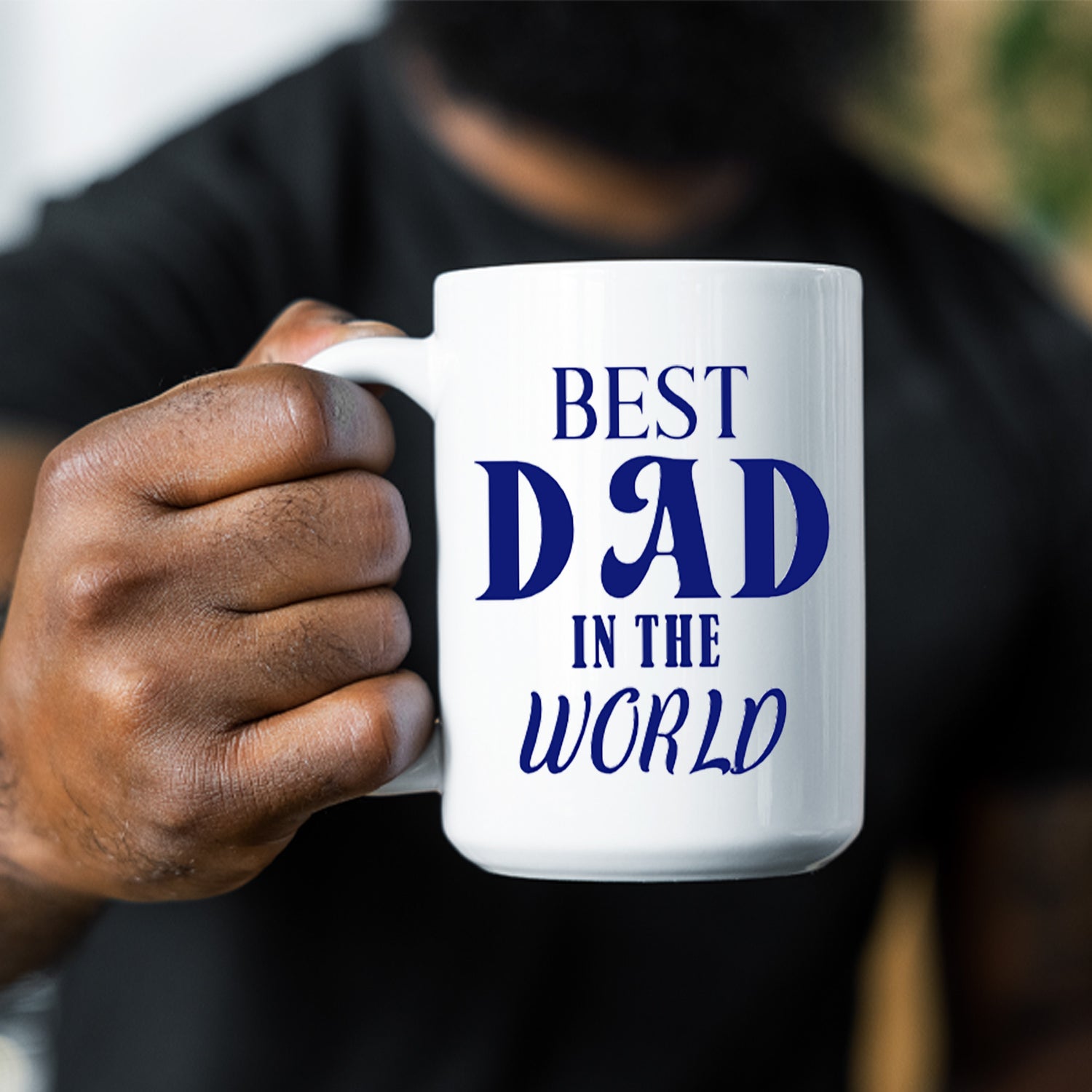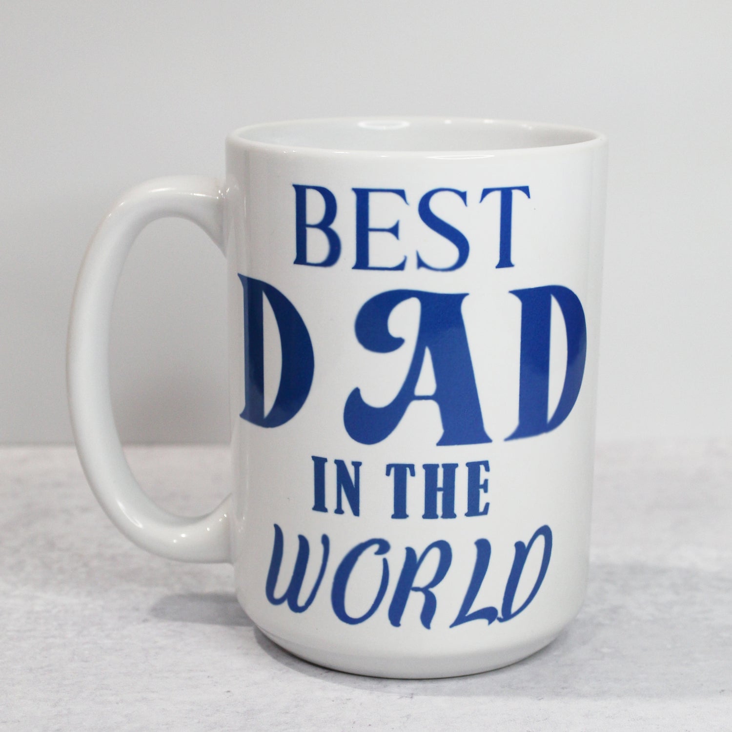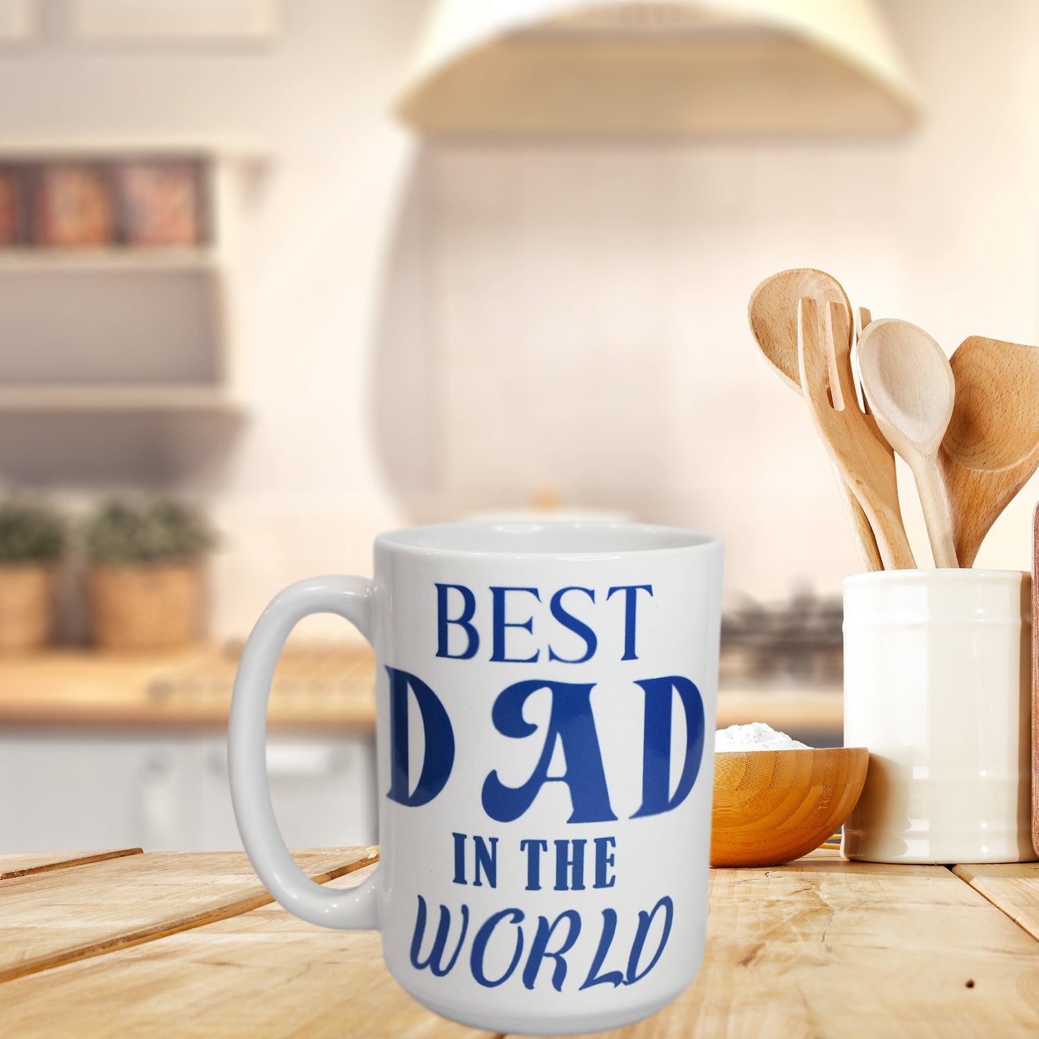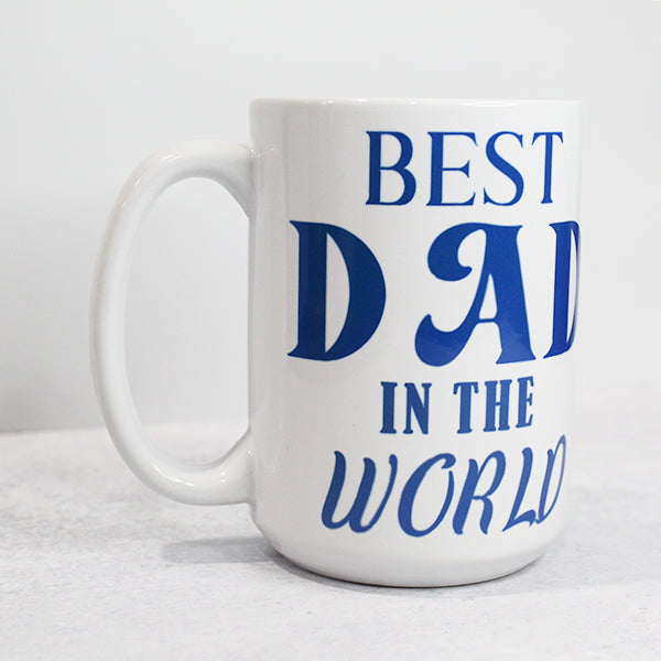- This 15 oz mug is dishwasher and microwave safe. The blue design is a unique design with the Dad being the biggest word on the cup, making it known that he is the "Best DAD in the World"