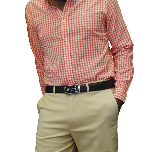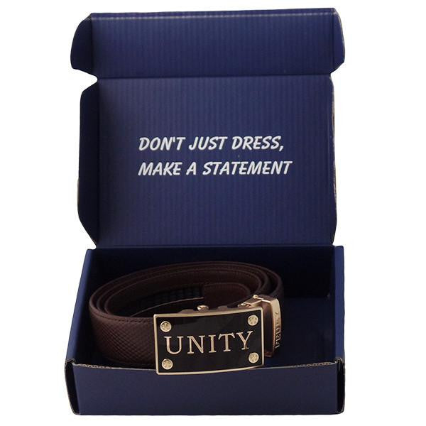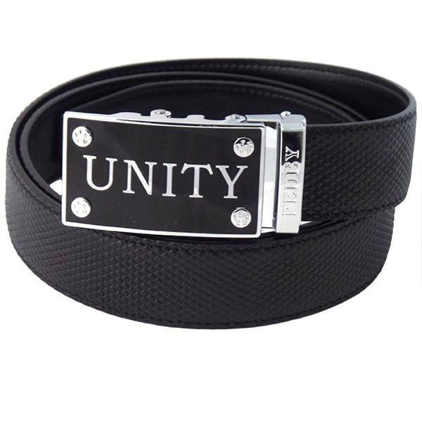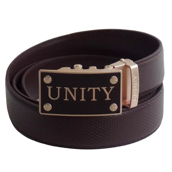 - Well-crafted Mens automatic genuine leather ratchet belt with a stylish buckle featuring the statement UNITY. Belt strap is 1.4” wide. Buckle is roughly 1.6” wide by 2.7” long