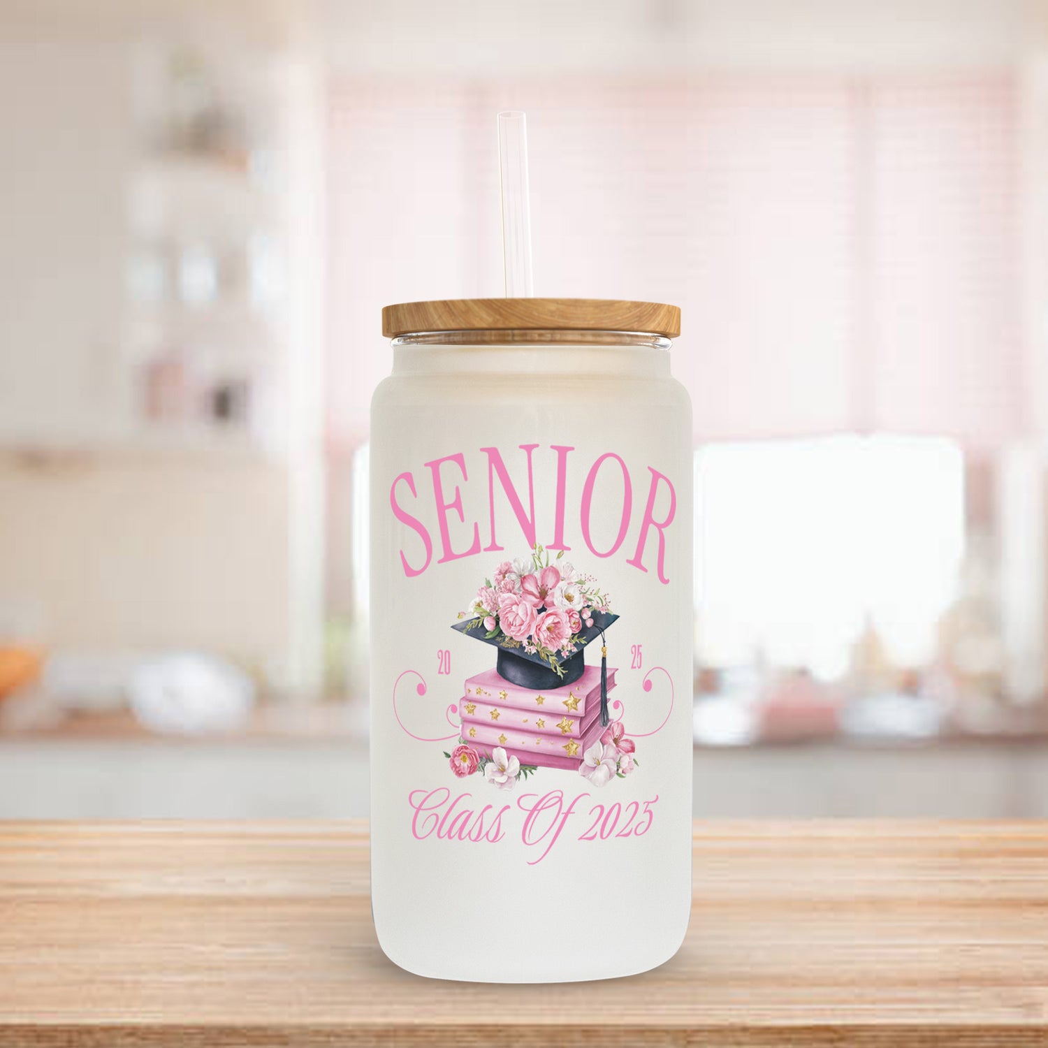 Floral Graduation Senior Iced Coffee Glass, Pink Cap Design, Class of 2025 Gift for Her