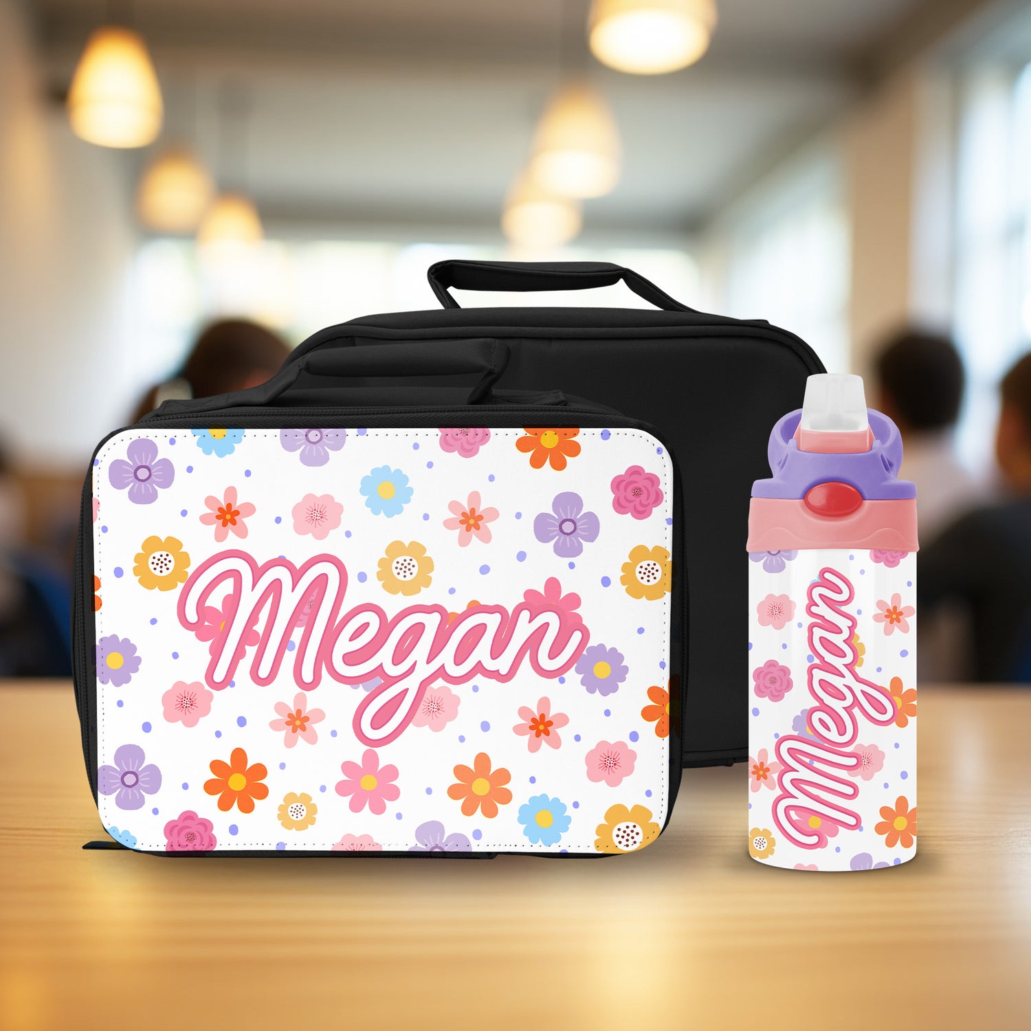 Make back to school more fun and stylish with this personalized flower lunch box and water bottle set for girls. This lunch box with name and custom water bottle is perfect for school, daycare, or preschool. Designed with both function and charm in mind, it makes one of the best personalized back to school gifts for kids who love floral and girly styles.