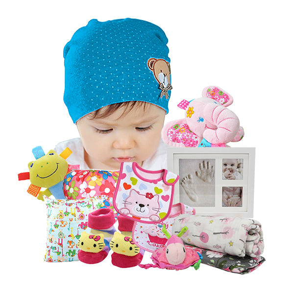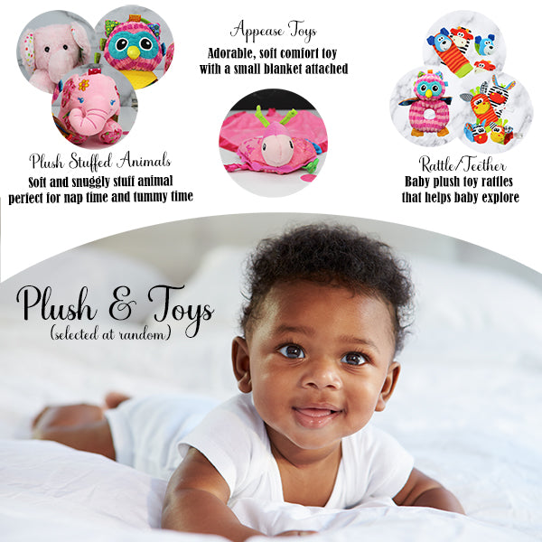 - This adorably packaged gift set includes some essential must haves, baby developmental toys and cute keepsakes