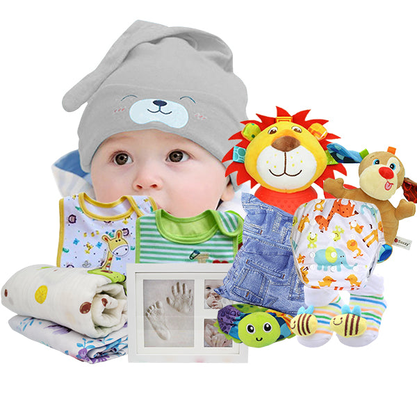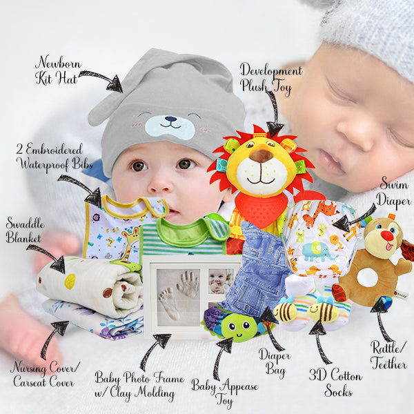 - This adorably packaged gift set includes some essential must haves, baby developmental toys and cute keepsakes
