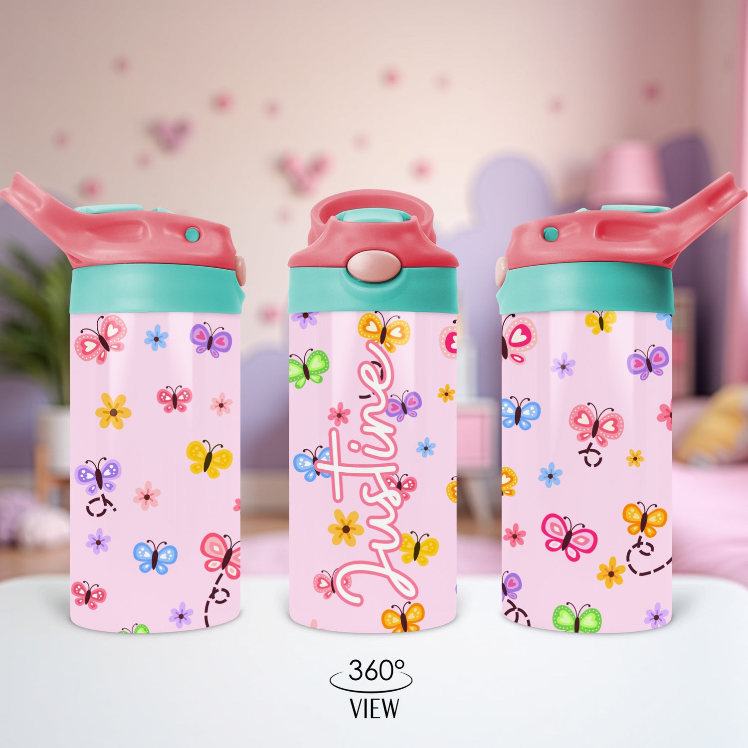 Girls Butterfly Water Bottle with Flip Top Lid, Personalized Back to School Gifts for Kids
