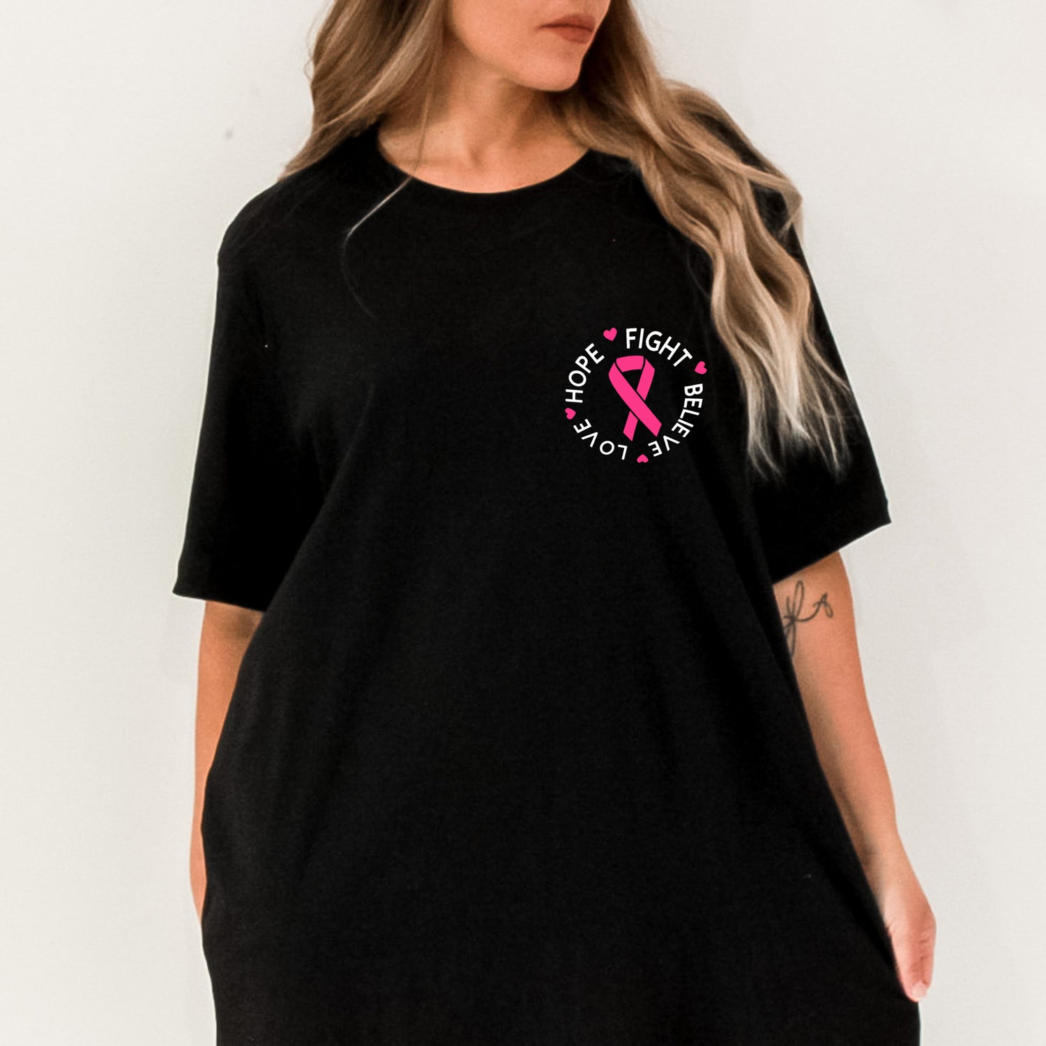 Hope Fight Believe Love Pocket Breast Cancer Awareness Month TShirt - Black / XS is backordered and will ship as soon as it is back in stock.
