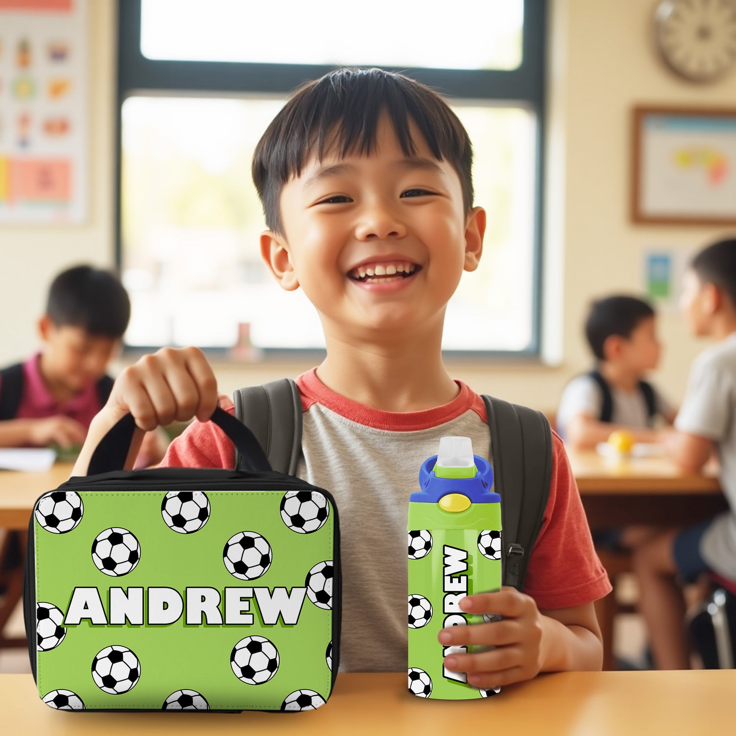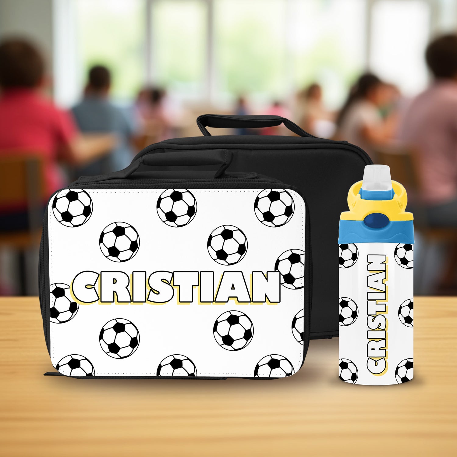 Perfect for parents searching for a custom soccer lunch box, personalized water bottles for kids, back to school lunch sets, or matching school gear for soccer lovers.