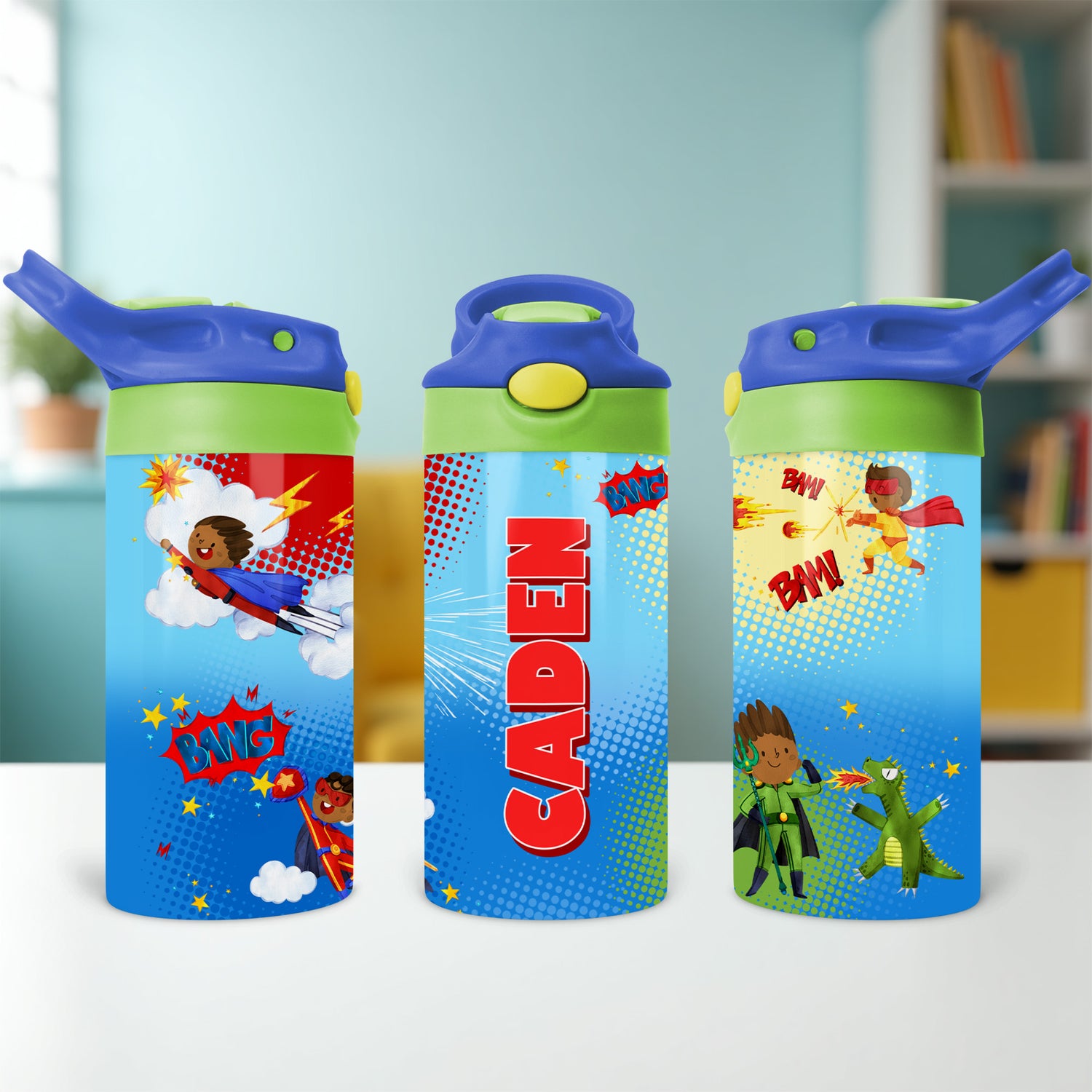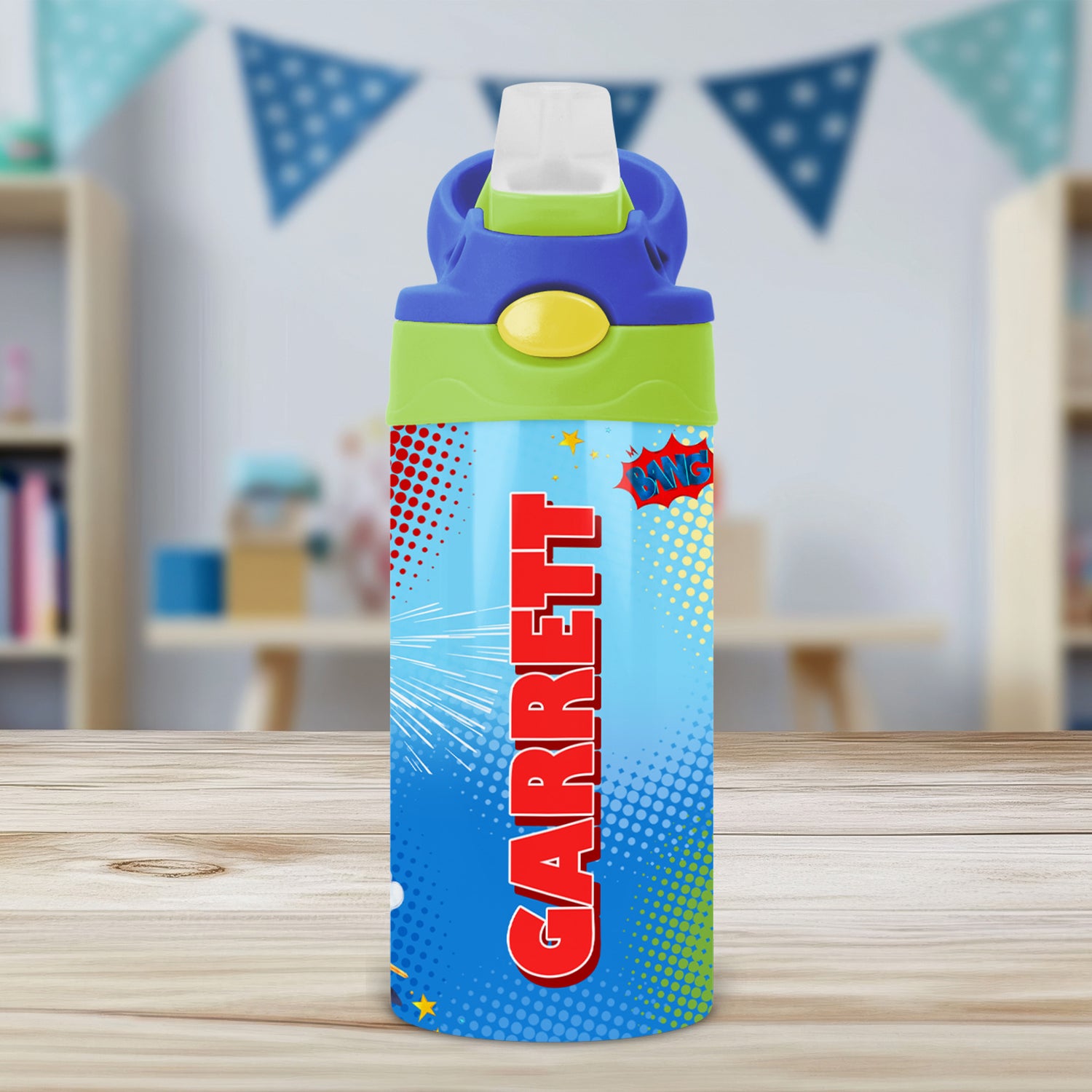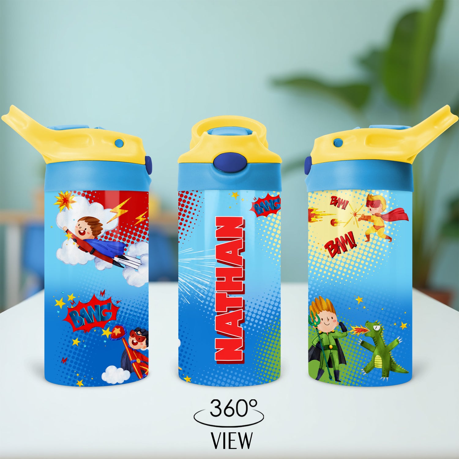Kids Superhero Water Bottle with Custom Name, Fun Personalized Drink Bottle for School