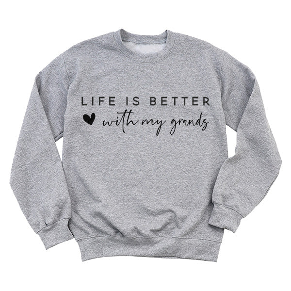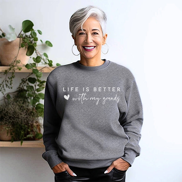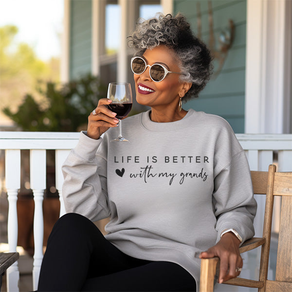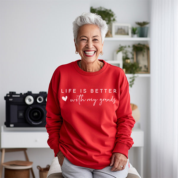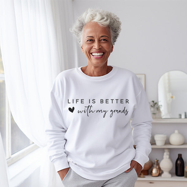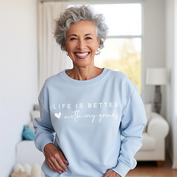 Wrap your grandmother in cozy warmth and sentiment with our 'Life is Better with My Grands' sweatshirt. Whether it's for her birthday, Mother's Day, or just to show your appreciation, this stylish and custom sweatshirt will remind her of the joy and love shared with her beloved grands. Perfect for celebrating the cherished bond between grandparents and grandchildren, this sweatshirt is a heartwarming gift for any occasion. Crafted with care and made from high-quality materials, it's a thoughtful and practical addition to her wardrobe. Let your grandmother showcase her pride and love for her grands with this delightful sweatshirt.