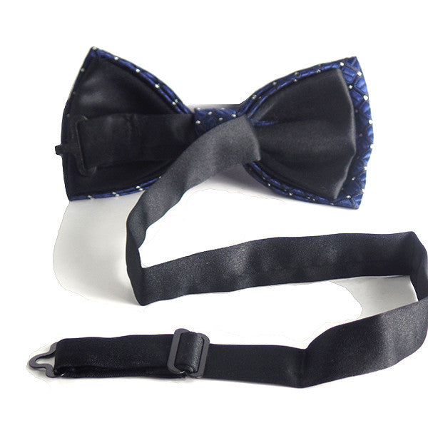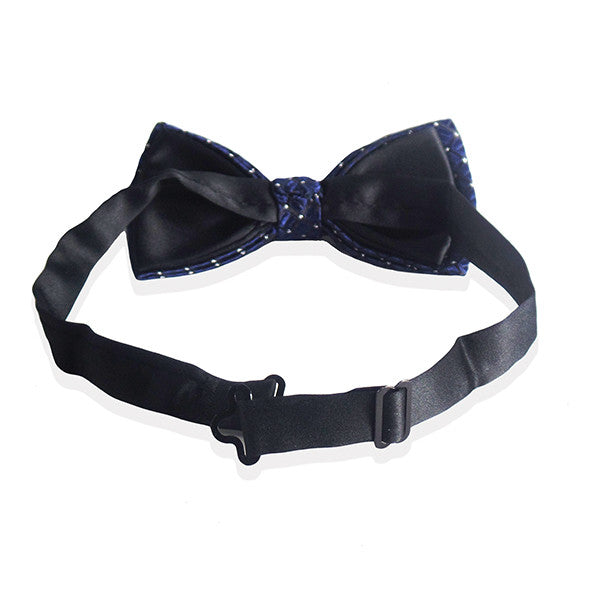 - This is a navy blue bow tie with silver embellishments and an adjustable black strap