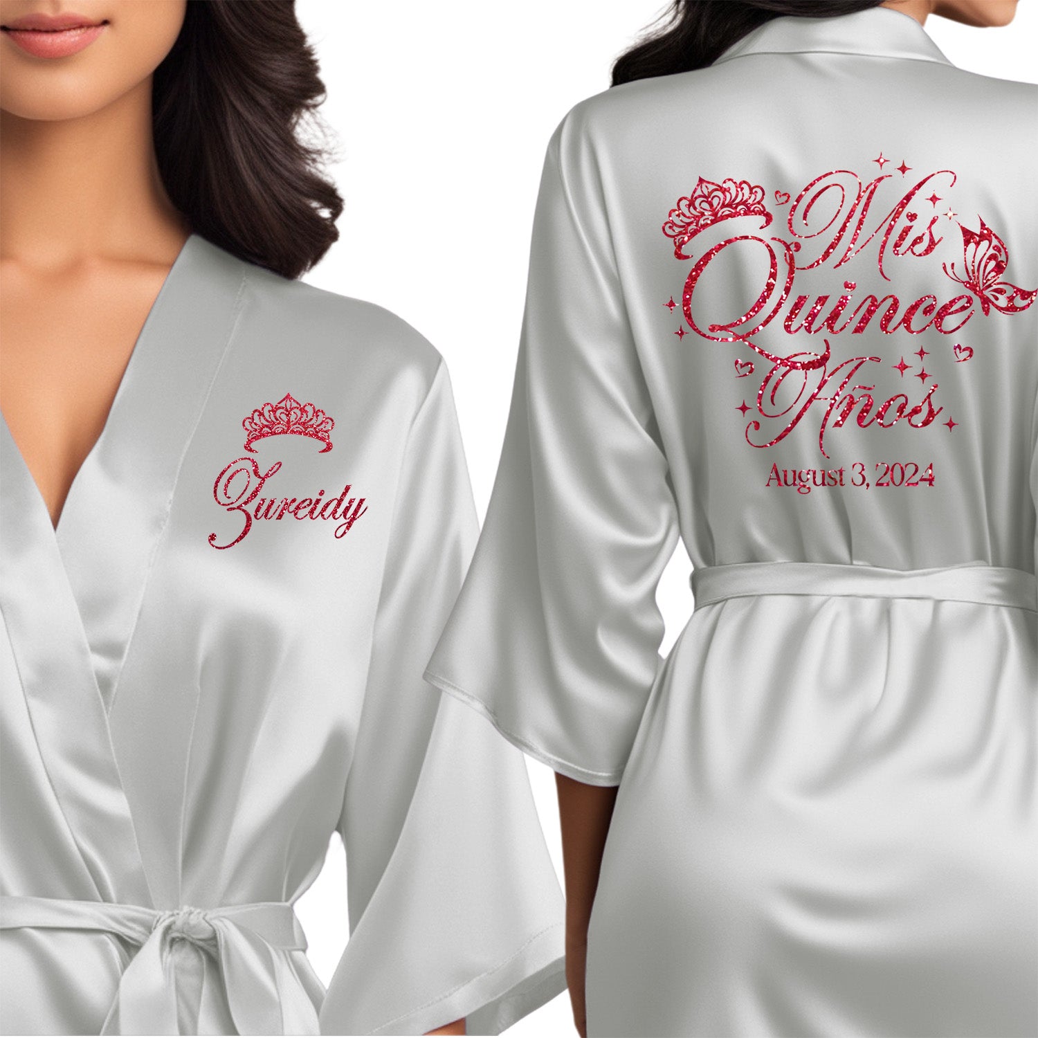 Step into your Quinceañera celebration in style with our Personalized Satin Quinceañera Robe. Crafted for your special day, this personalized Quinceañera robe exudes luxury and elegance. Ideal for getting ready moments and capturing unforgettable photos, it features beautiful glitter and regular text color options to match your Quinceañera party. Perfect for your Quince birthday, our personalized robe is a symbol of sophistication and grace as you embark on this milestone journey. Make your Mis Quince celebration truly memorable with our personalized robe for every member of the party. chose from Mis Quince Anos, Mama de la Quinceañera, Abuela de la Quinceañera, Tia de la Quinceañera, Hermana de la Quinceañera, Quinceañera Squad, Damas de la Quinceañera and more.