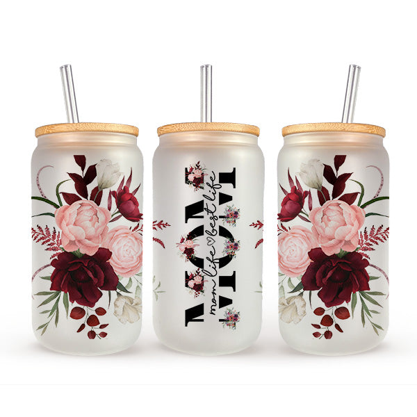 Cute Pink and Burgundy Floral Mom Life Best Life Iced Coffee Glass Tumbler