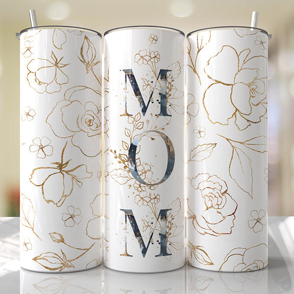 A gold floral 'Mom' tumbler. A perfect gift for Mothers Day, birthdays, or any occasion to show appreciation and love for the amazing mom in your life