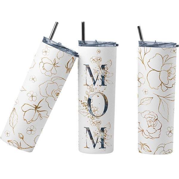 This 20oz tumbler is a great gift idea for mom. Elevate your mom's daily routine with our exquisite Gold Floral 20oz Mom Tumbler. This stunning drinkware for mom serves as a heartfelt tribute to the special bond between mother and child. Adorned with elegant floral designs and the endearing title Mom, this tumbler combines style and sentimentality in one beautiful package for a great Mother's Day gift. Crafted with high-quality materials, it ensures durability and longevity, making it a cherished keepsake for years to come. This is a great first Mother's Day gift or use as an expectant Mothers gift.