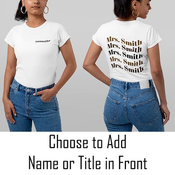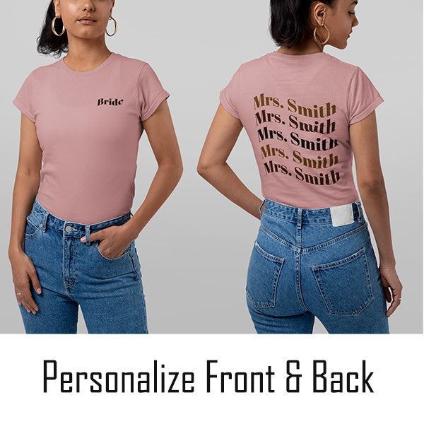 Our Mrs. Shirts are a great gift for any bride, bride to be, or wife. Personalize these shirts with the Mrs. last name, and add first name, title, or other text to the front. The sleeves can also be personalized with the established date. Go for an oversized look with our sweatshirts and hoodies (for the oversize look, go up 1 or 2 from normal size) or choose a crewneck, long sleeved or tank top style.