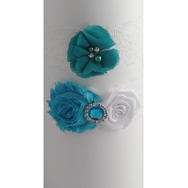 - Ocean theme handcrafted white lace wedding garters with turquoise blue, teal and white roses