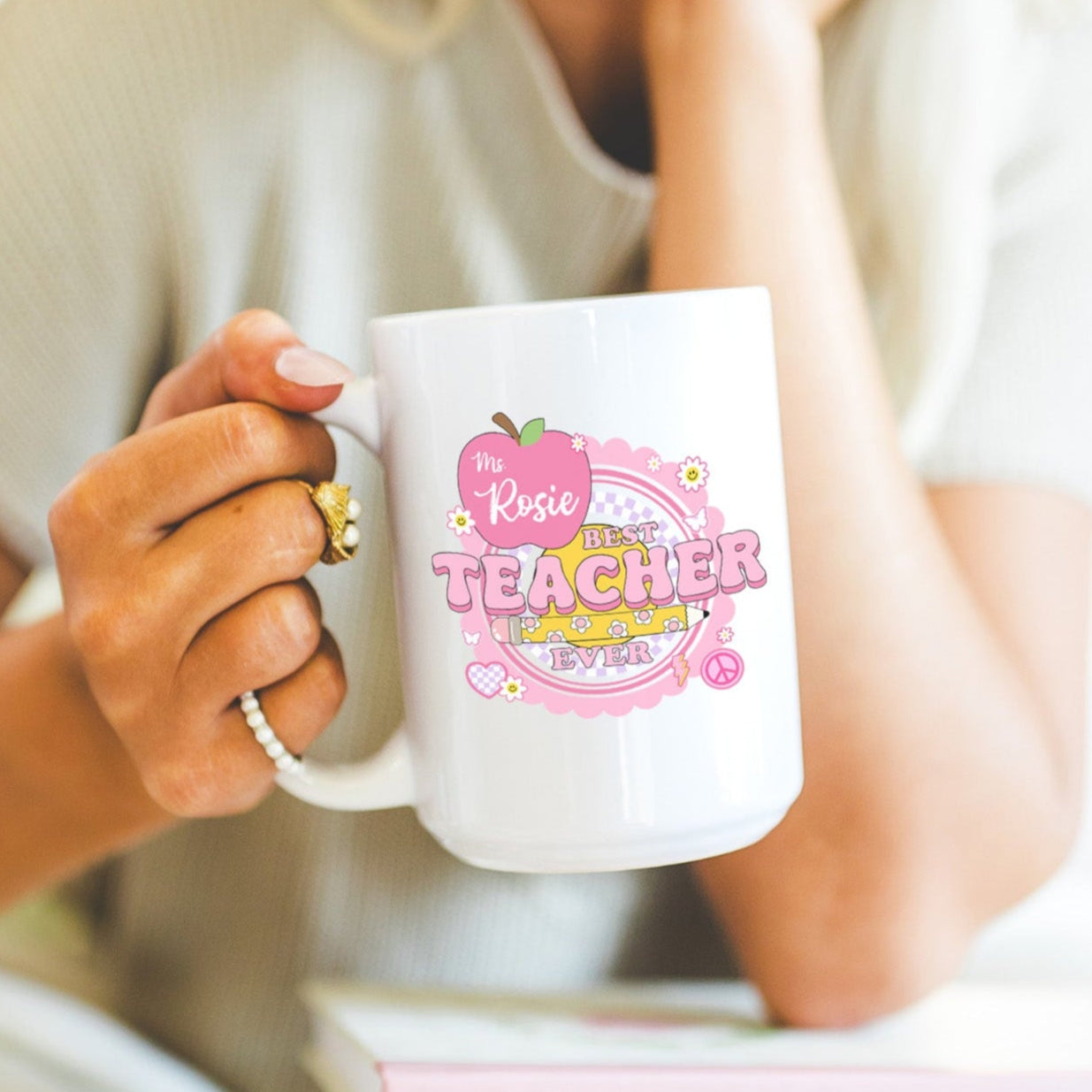 Perfect for those searching for custom teacher mugs, personalized teacher gifts for women, Best Teacher Ever mug with name, and teacher appreciation gifts 2025.